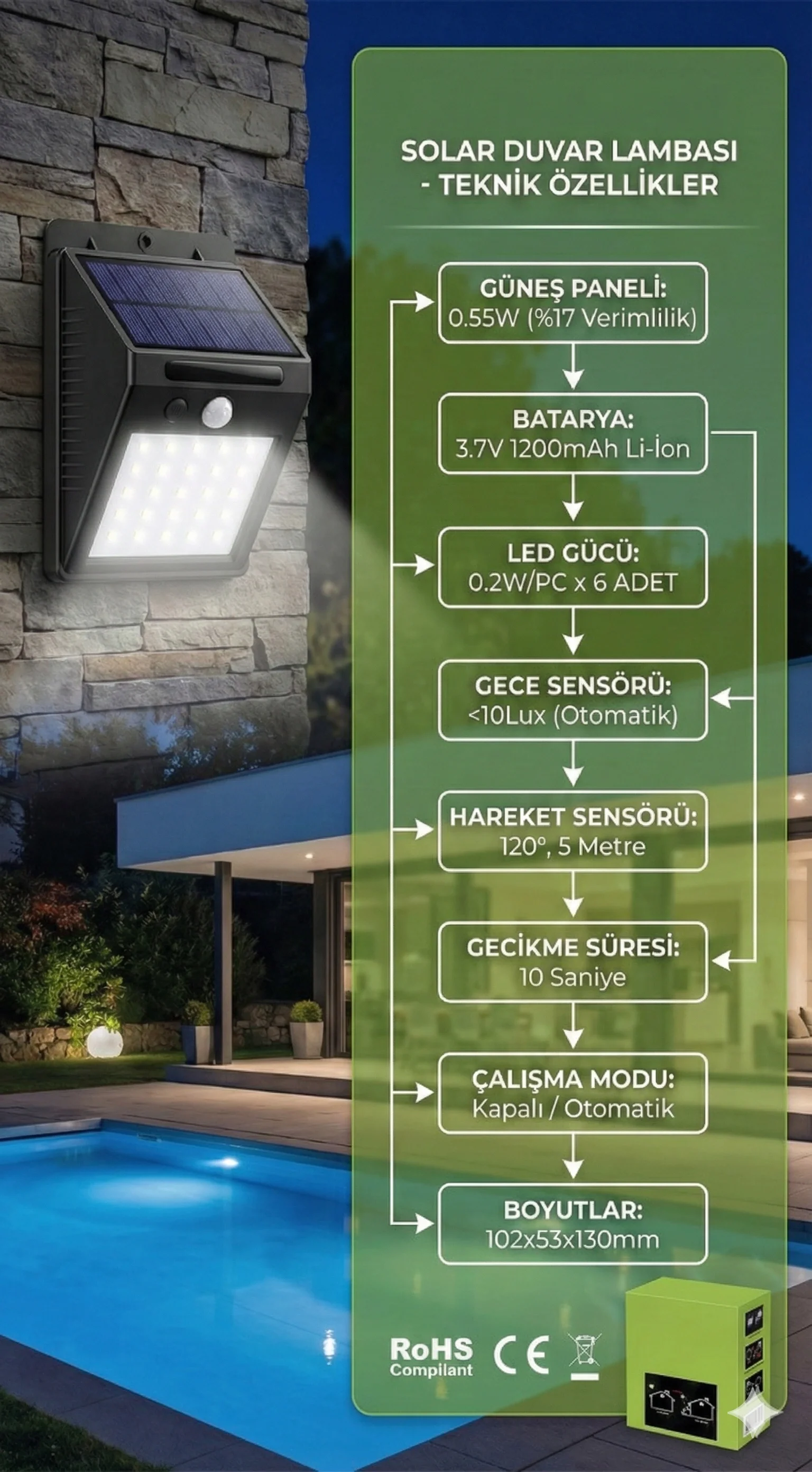 Paket İçeriği : 1 Adet Hareket Sensörlü Solar Dış Mekan Lambası