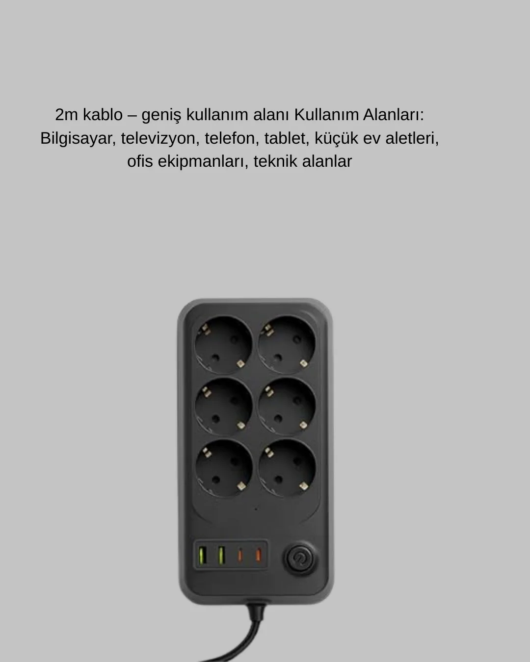 2500W Güçlü 6’lı Priz USB ve Type-C Çıkışlı Termal Korumalı