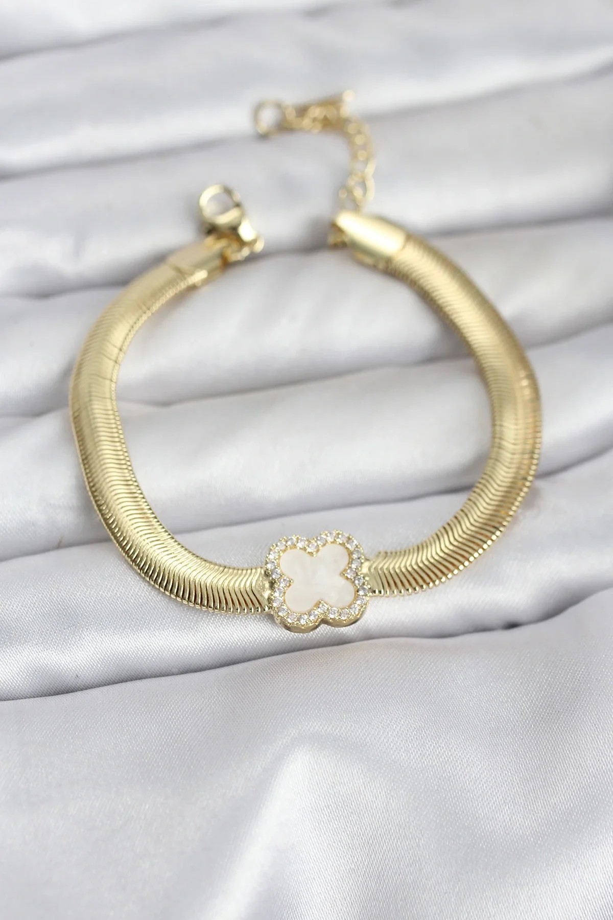 316L Çelik Gold Renk Beyaz Yonca Model Zirkon Taşlı Yılan Zincirli Kadın Bileklik
