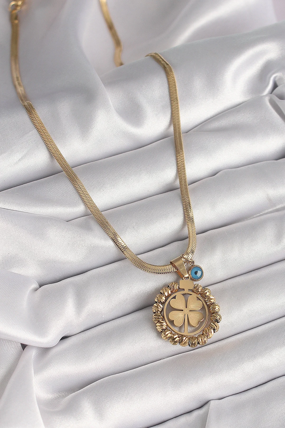 316L Çelik Gold Renk İtalyan Zincir Dorika Yonca Model Nazar Boncuk Detay Kadın Kolye