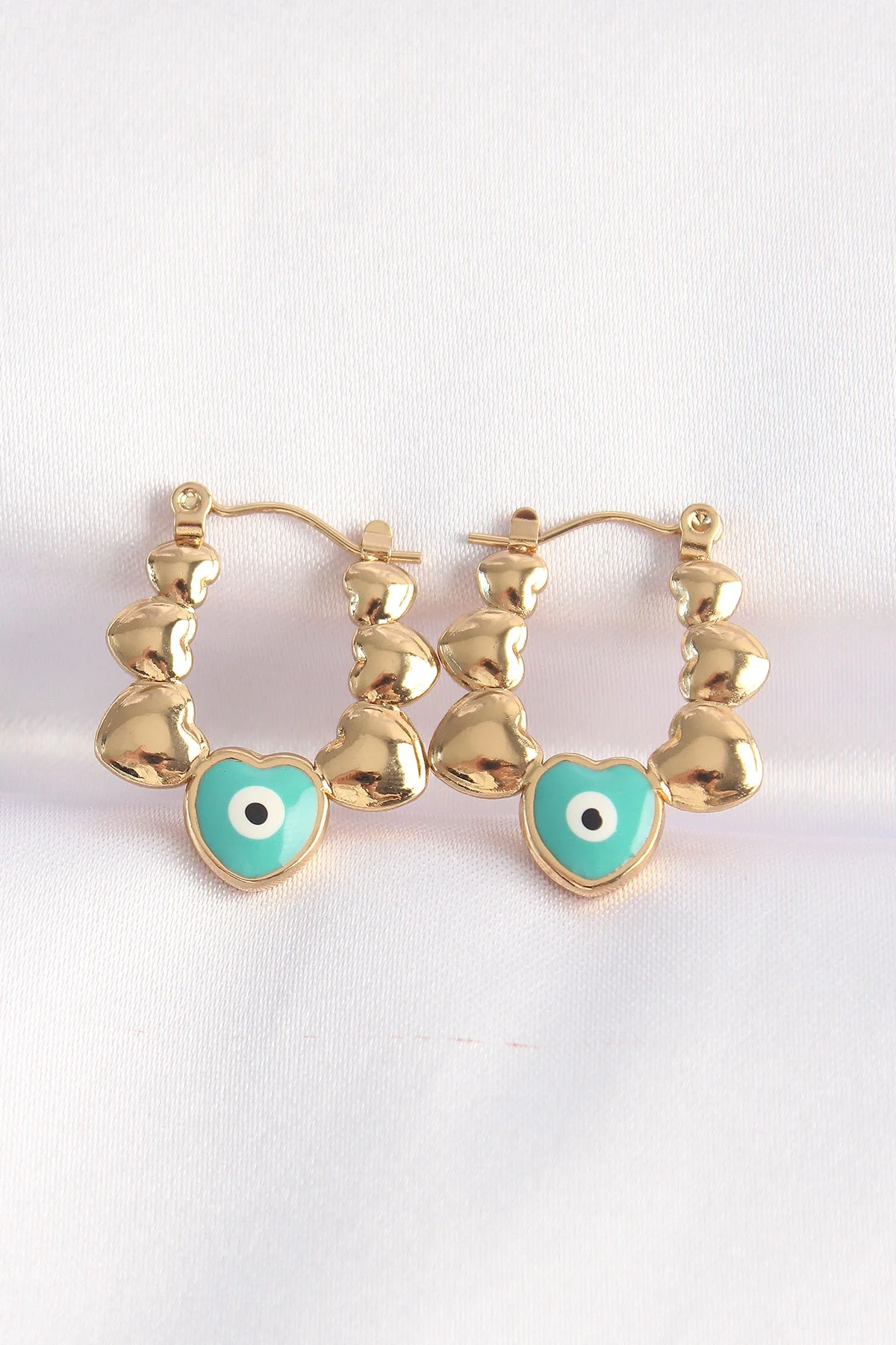 316L Çelik Gold Renk Mavi Nazarlı Kalpli Model Küpe