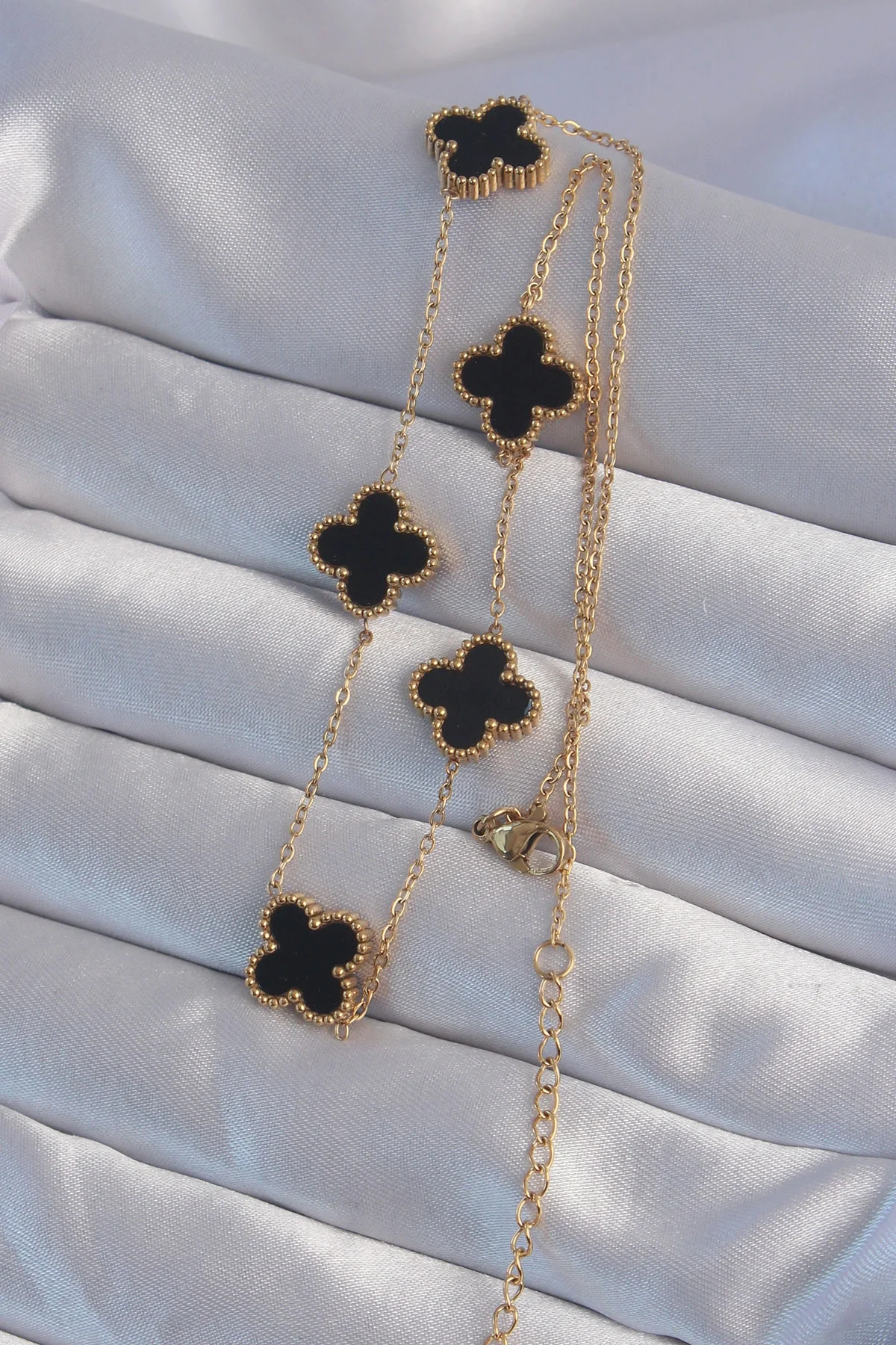 316L Çelik Gold Renk Siyah Mineli Yonca Kolye
