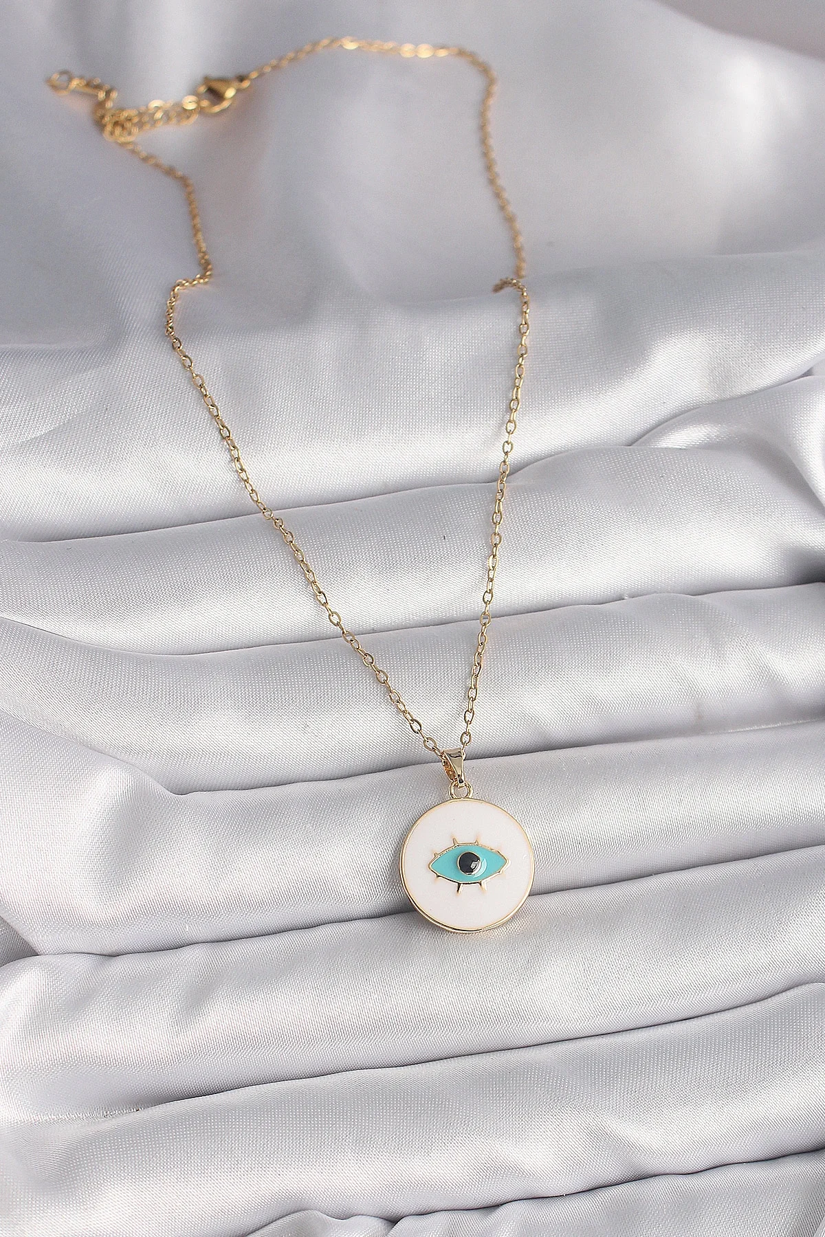 316L Çelik Gold Renk Zincir Beyaz Mineli Turkuaz Göz İşleme Model Kadın Kolye