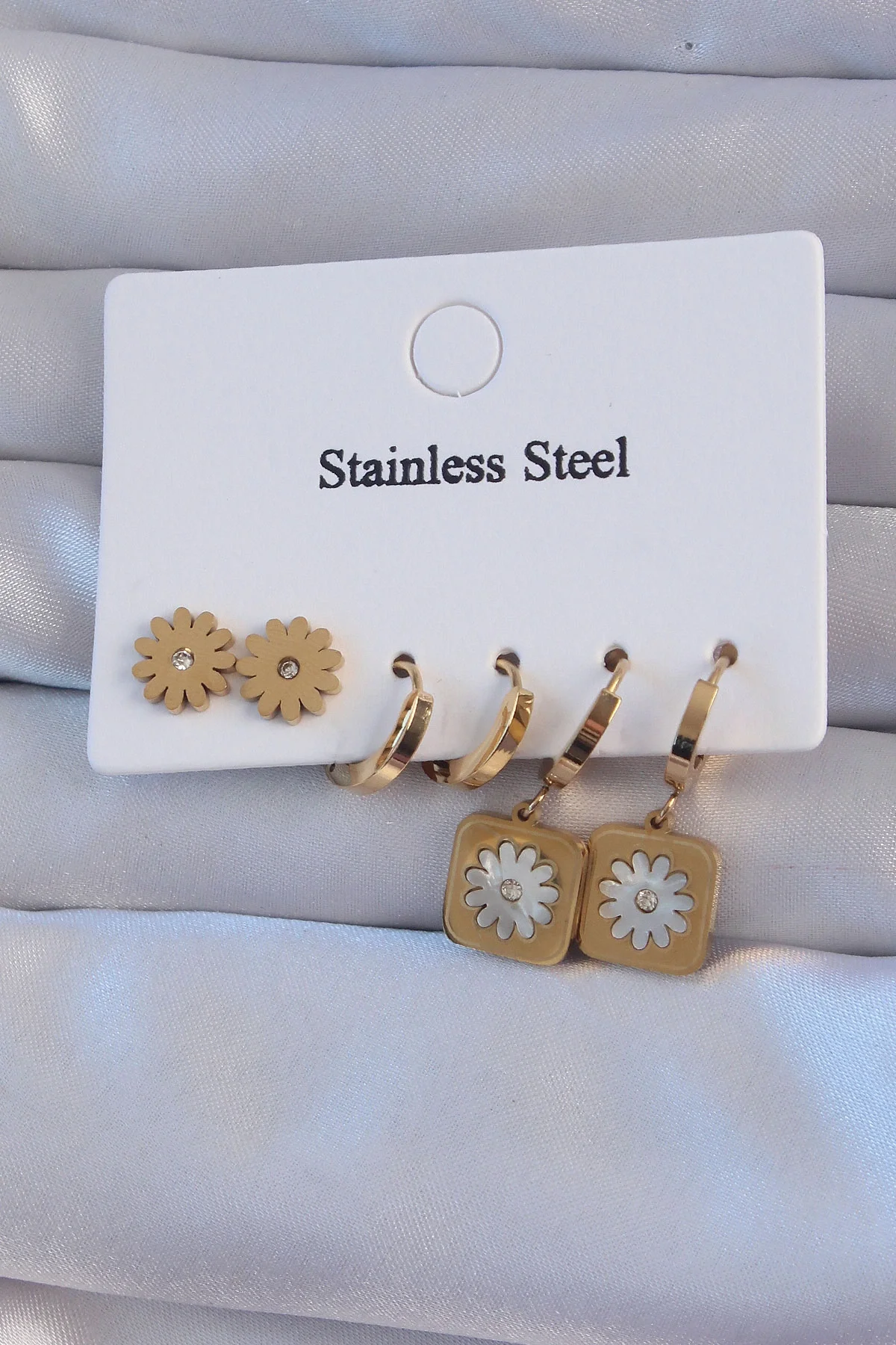 316L Çelik Gold Renk Zirkon Taşlı Sedefli Papatya Model Halka Küpe Seti
