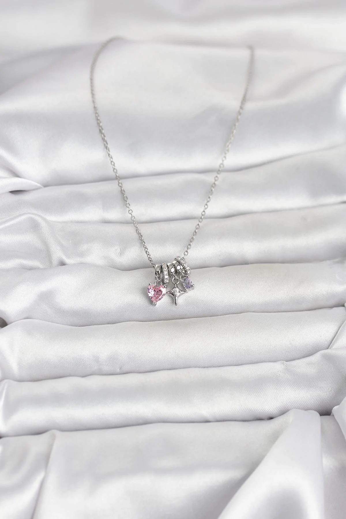 316L Çelik Gümüş Pembe Zirkon Taşlı Charmlı Kadın Kolye