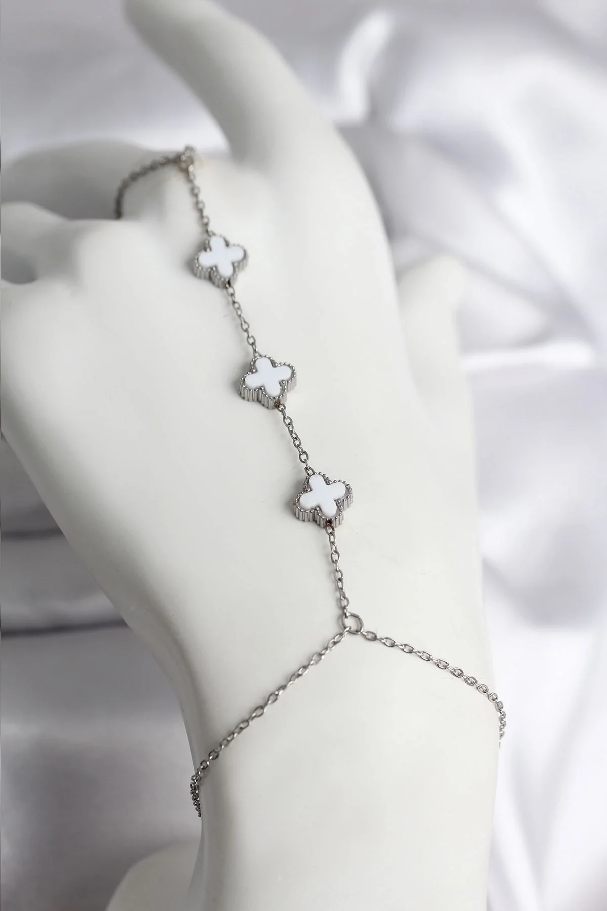 316L Çelik Gümüş Renk Beyaz Yonca Model Kadın Şahmeran