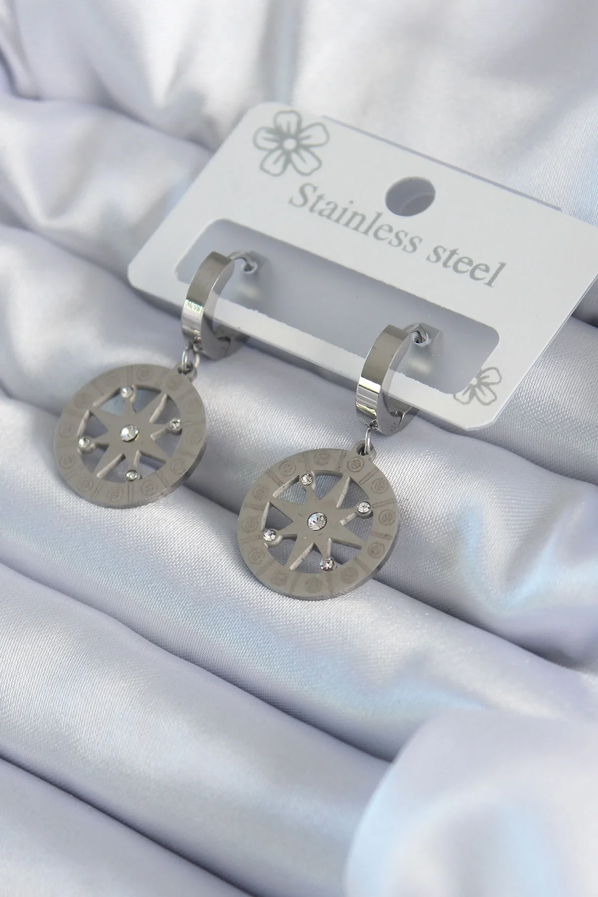 316L Çelik Gümüş Renk Kutup Yıldızı Model Zirkon Taş İşleme Detay Kadın Küpe