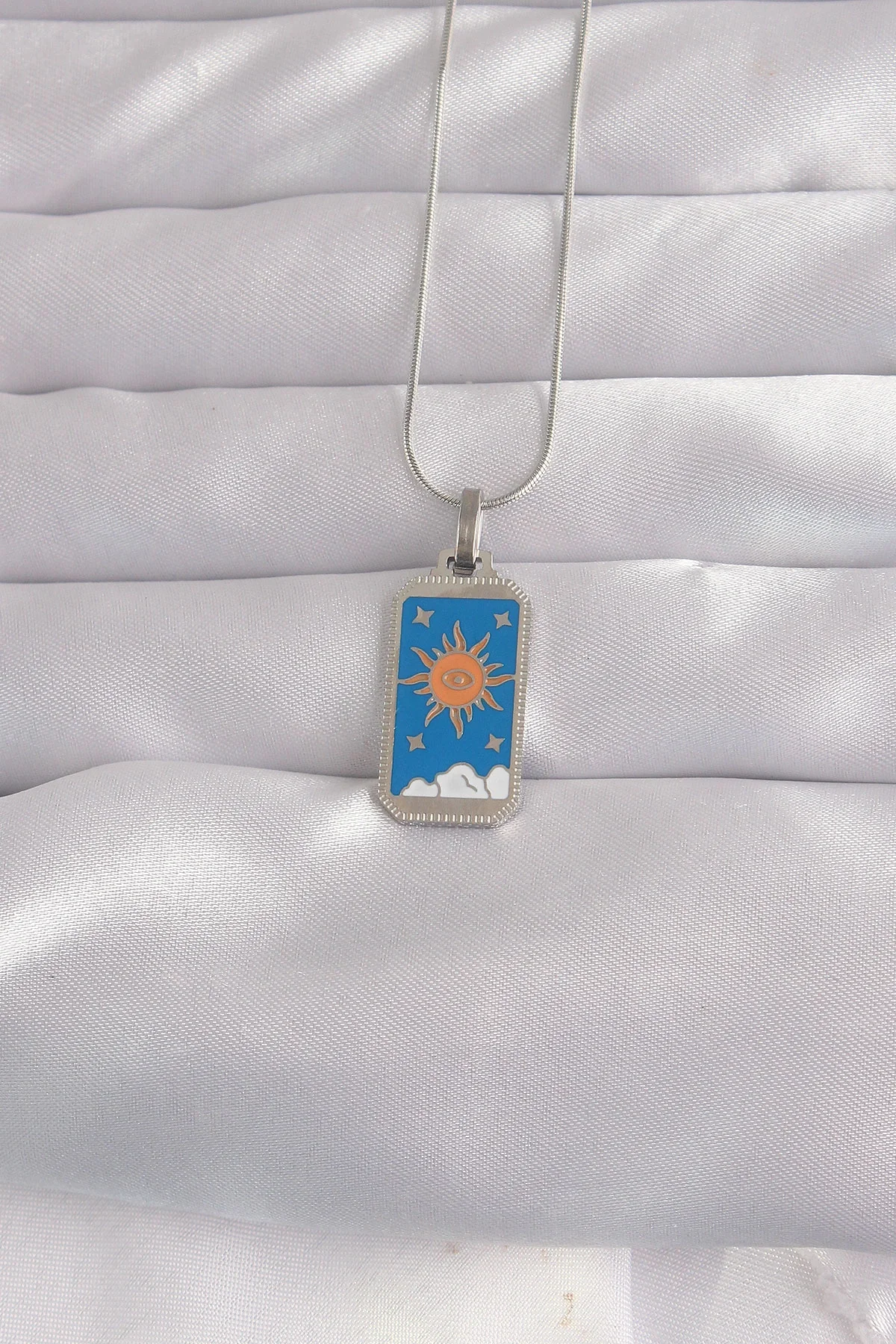 316L Çelik Gümüş Renk Mavi Mineli Güneş Model Tarot Kolye