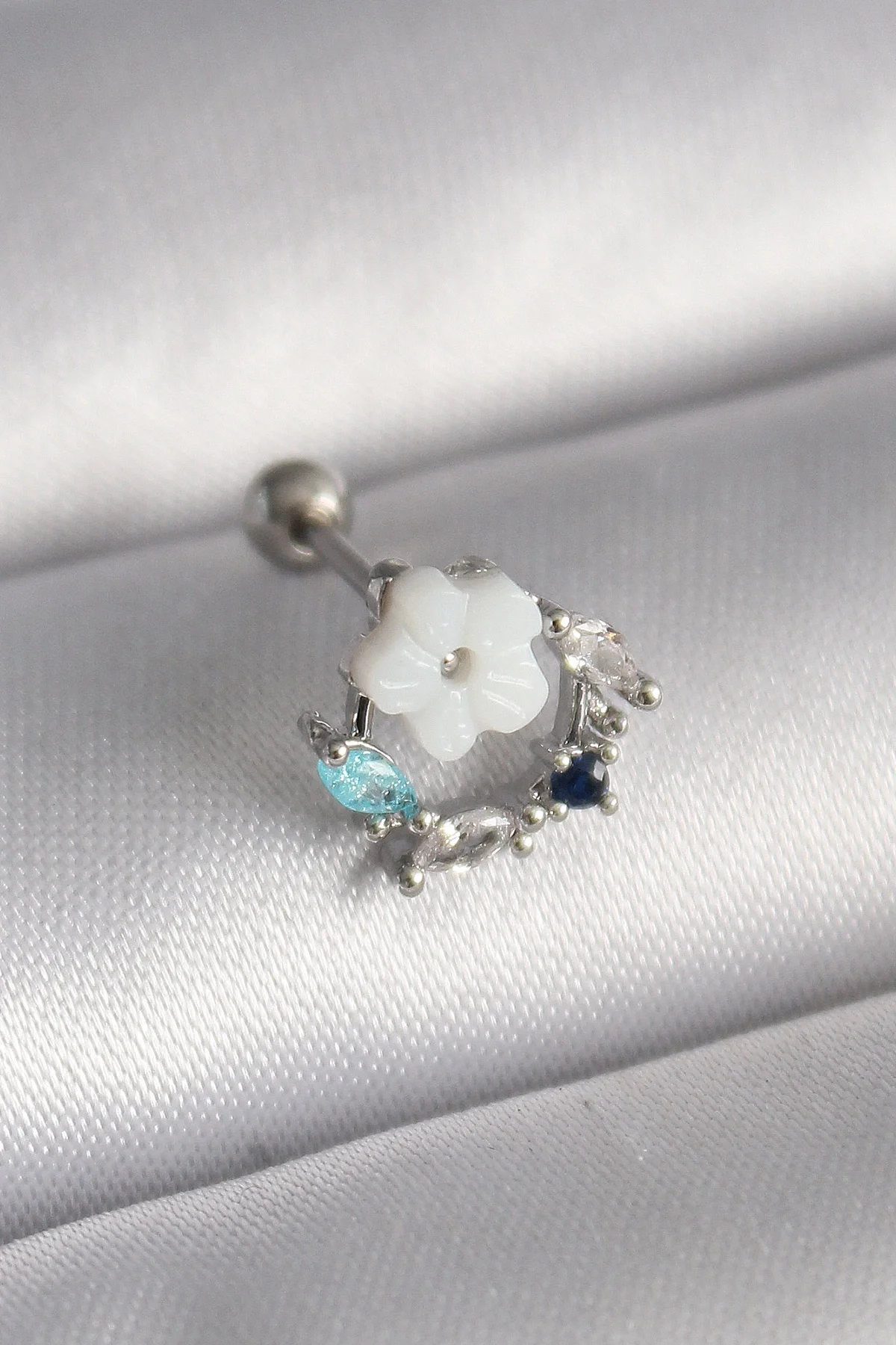 316L Çelik Gümüş Renk Zirkon Taş Detay Beyaz Çiçek Model Tragus Piercing
