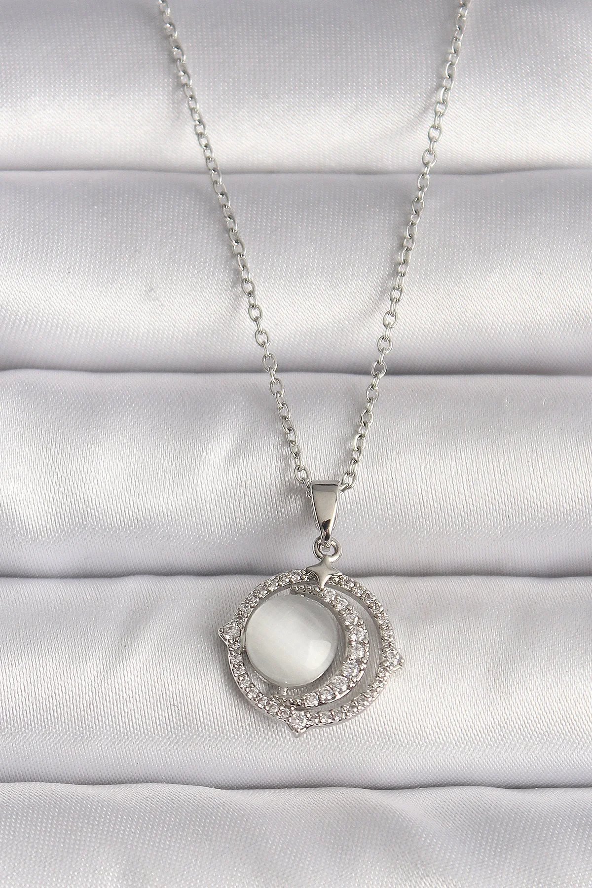 316L Çelik Gümüş Renk Zirkon Taşlı Beyaz Sedefli Hilal Model Kadın Kolye