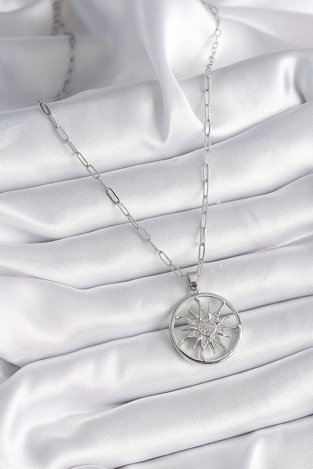 316L Çelik Gümüş Renk Zirkon Taşlı Güneş Madalyon Model Kadın Kolye