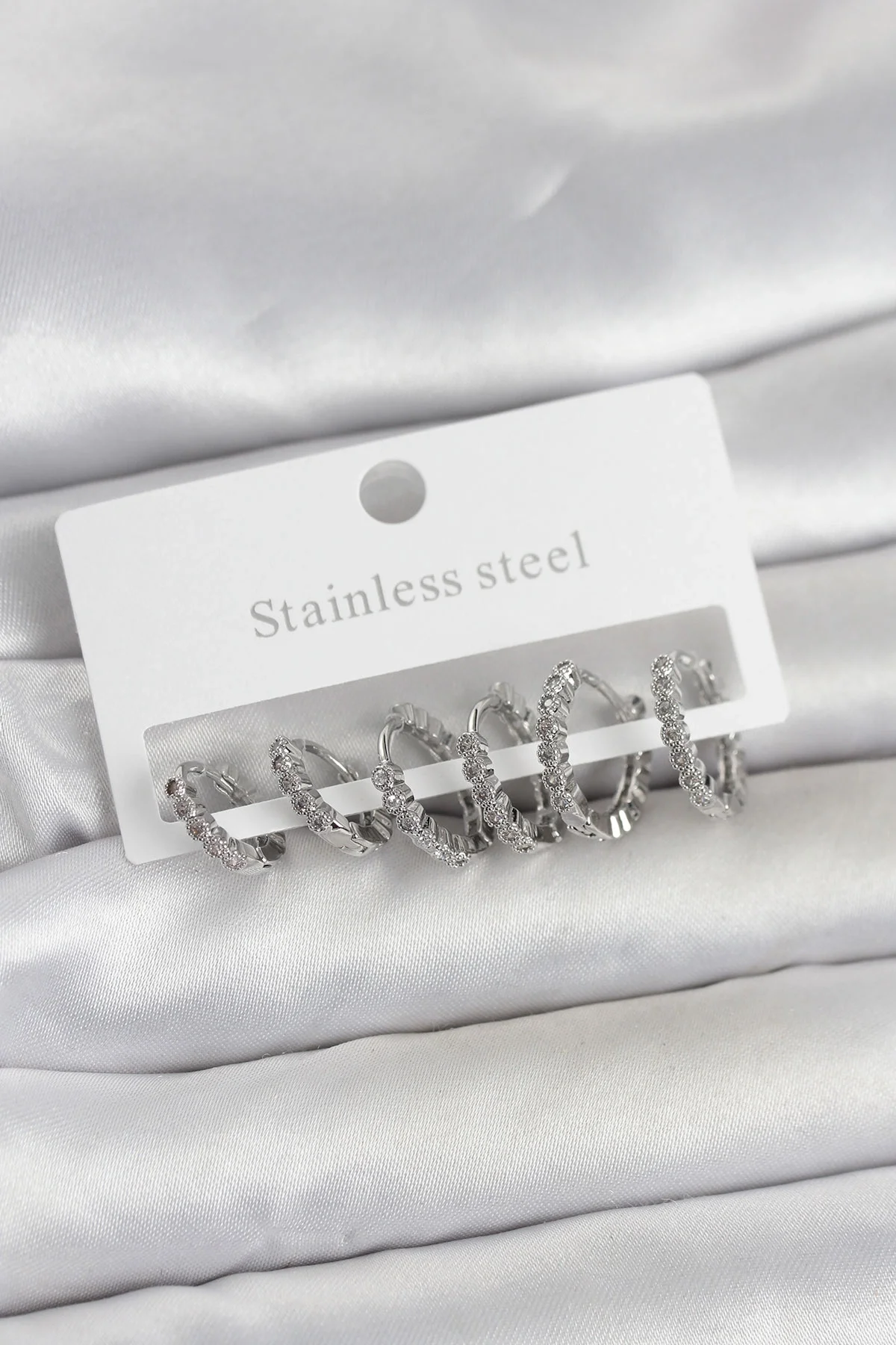 316L Çelik Gümüş Renk Zirkon Taşlı Halka Model Kadın Küpe Seti