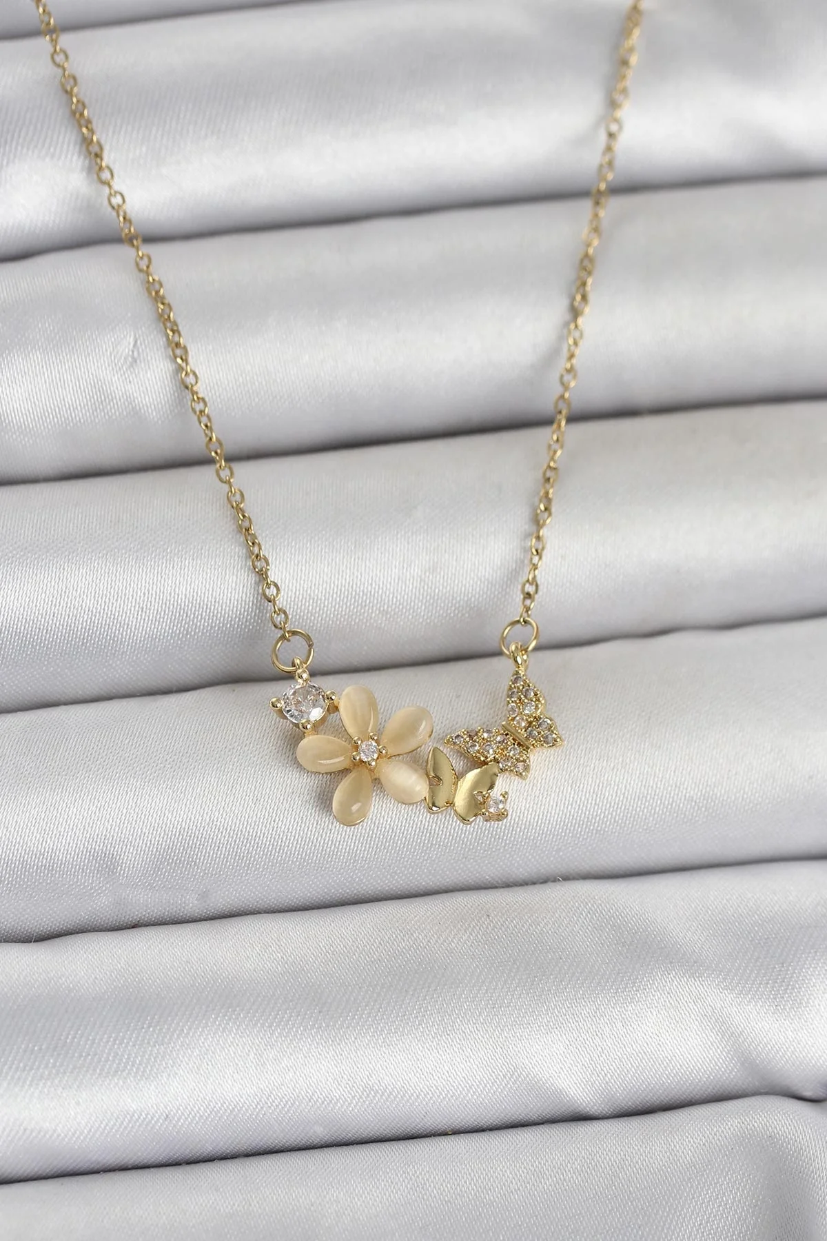 316L Çelik Zincir Gold Renk Çiçek ve Kelebek Model Kadın Kolye