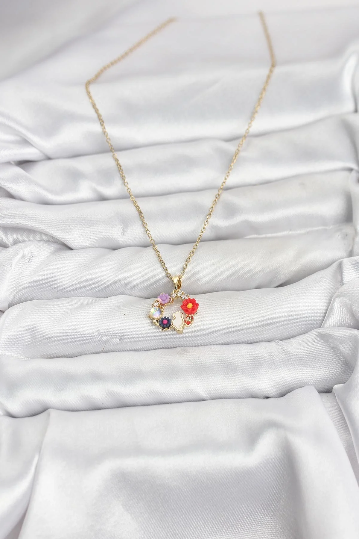 316L Çelik Zincir Gold Renk Çiçekli Kedili Model Kadın Kolye