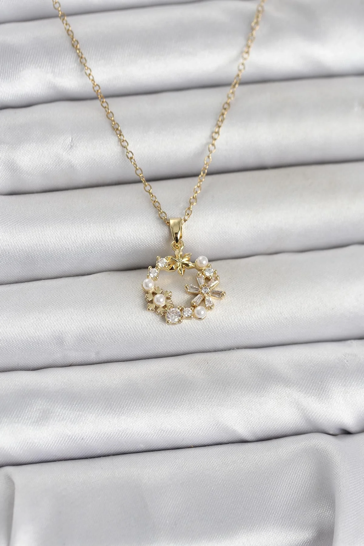 316L Çelik Zincir Gold Renk İncili Çiçek Model Kadın Koyle