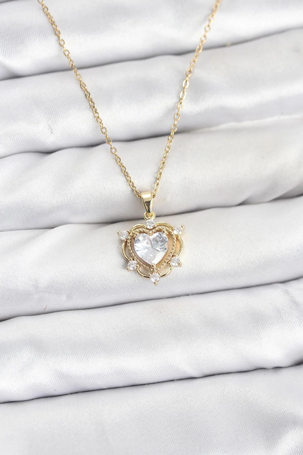 316L Çelik Zincir Gold Renk Kalp Model Zirkon Taşlı Kadın Kolye