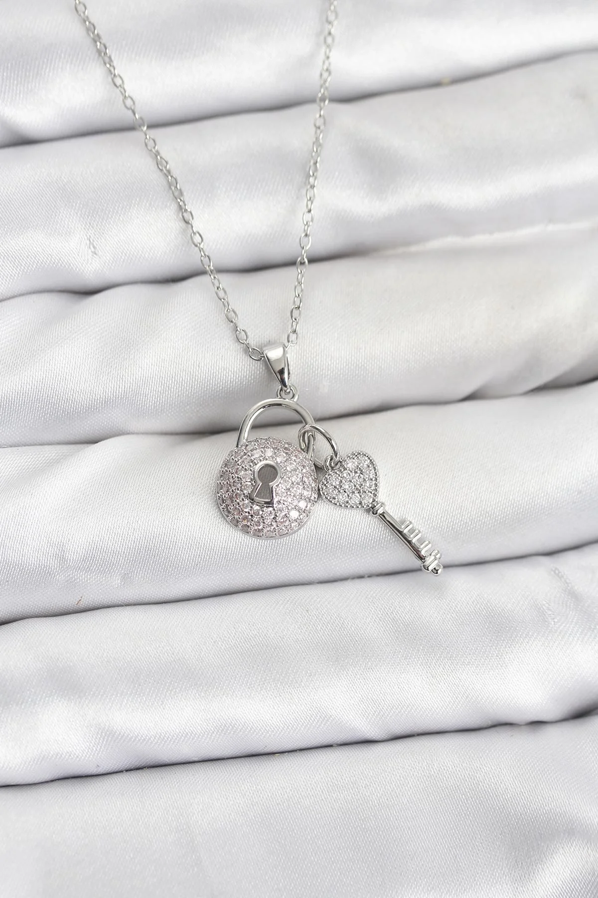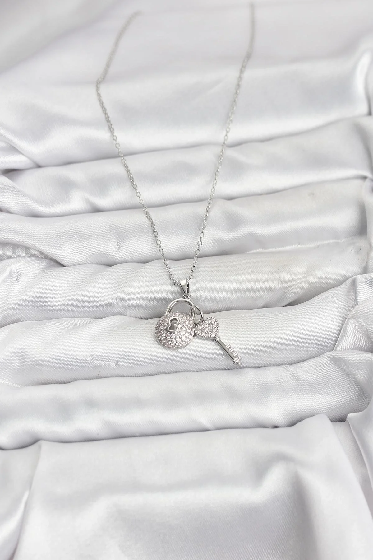 316L Çelik Zincir Gümüş Renk Kilit Anahtar Model Zirkon Taşlı Kadın Kolye