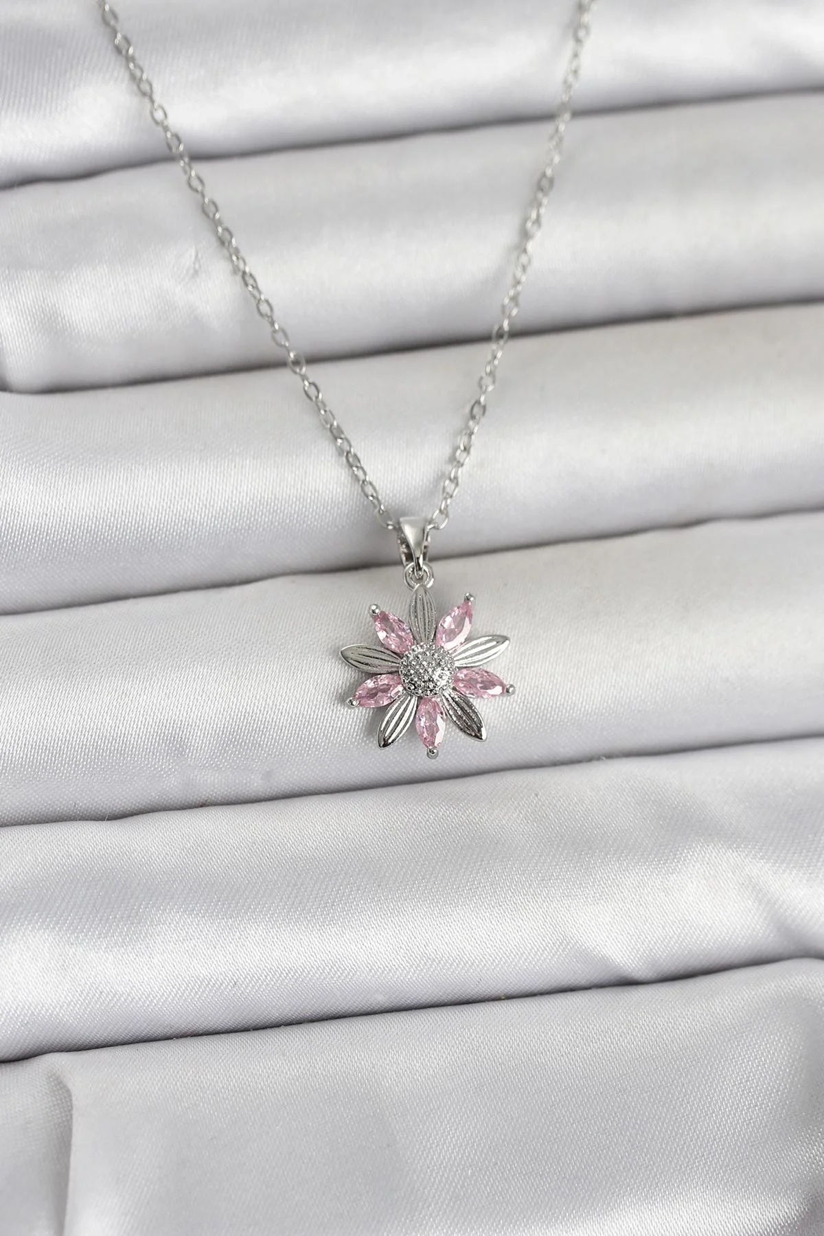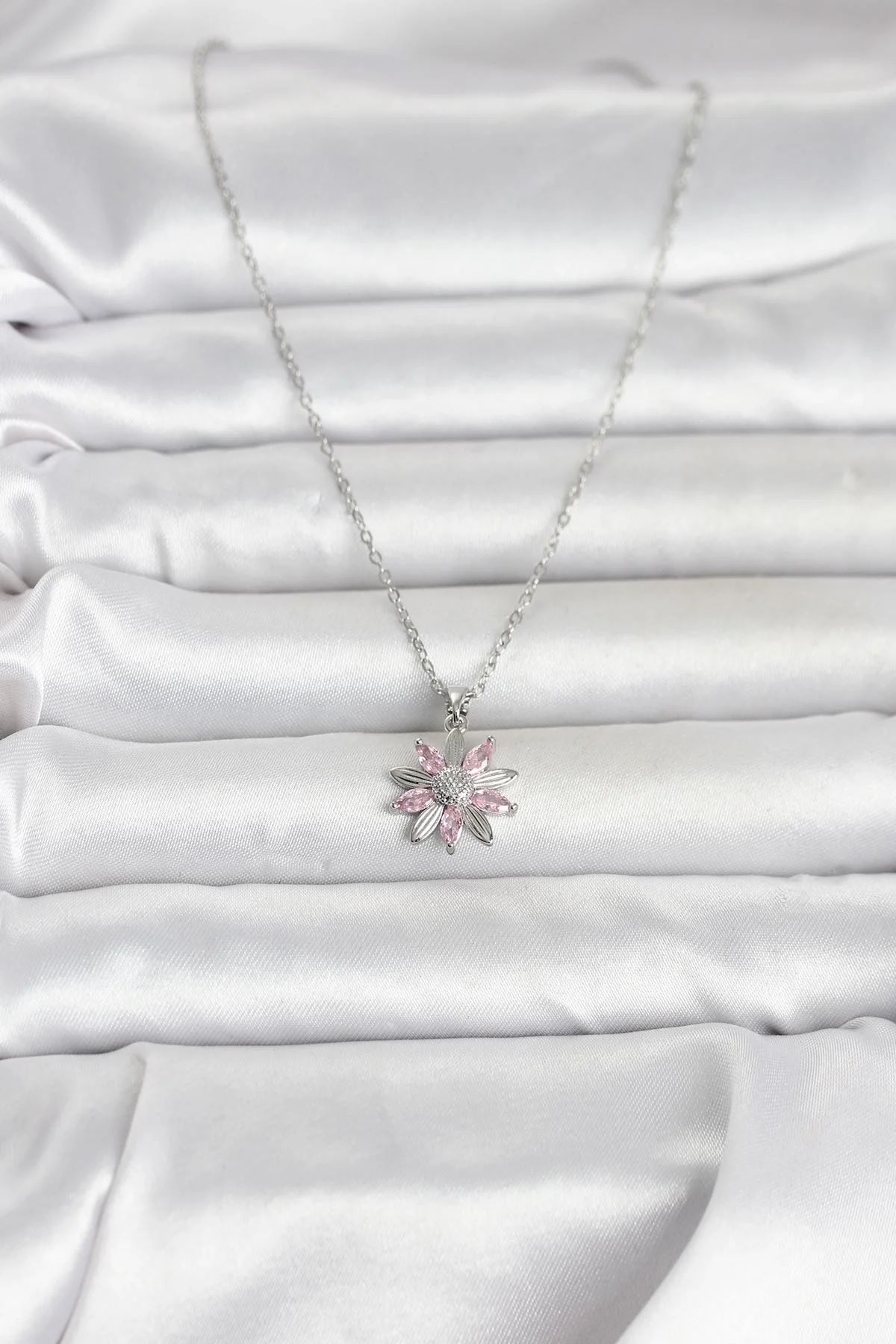 316L Çelik Zincir Gümüş Renk Pembe Papatya Model Kadın Kolye