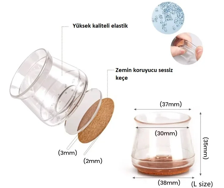 Paket İçeriği: 4 Adet (1 Sandalye içindir) L BEDEN 4'lü Keçeli Şeffaf Silikon Sandalye Ayak Koruyucu Seti