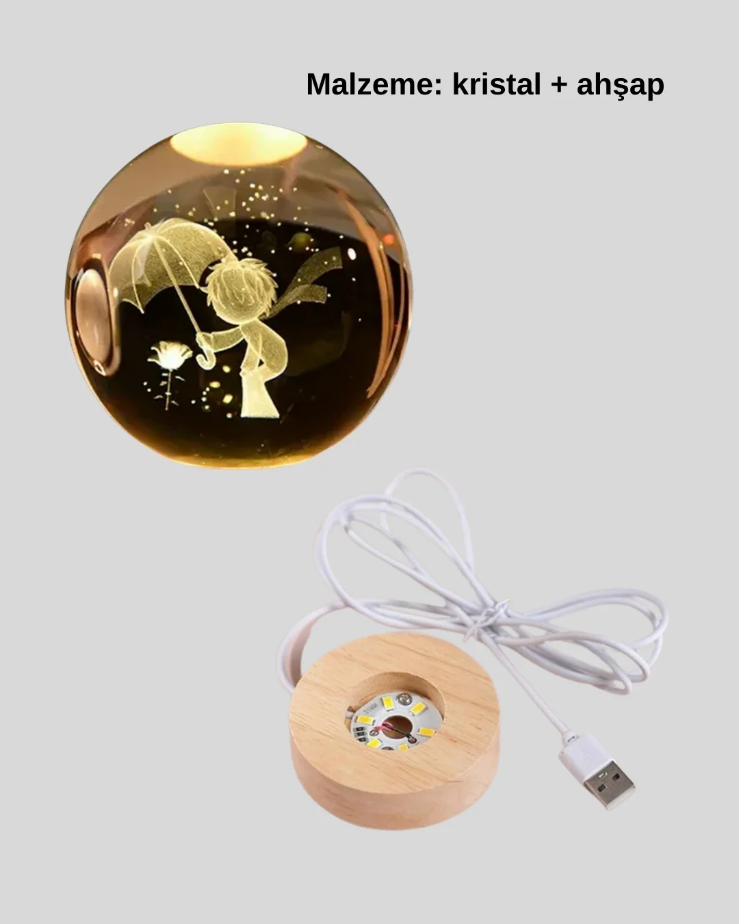 8 cm Küçük Prens 3D Kristal Küre USB Işıklı Ahşap Altlıklı Dekoratif Lamba