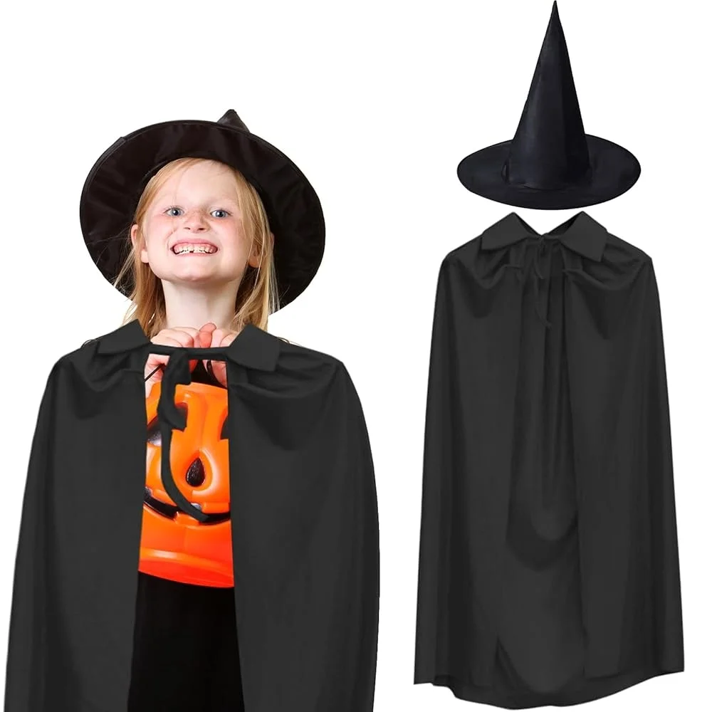 90 cm Siyah Yakalı Pelerin ve Siyah Cadı Şapkası Kostüm Seti