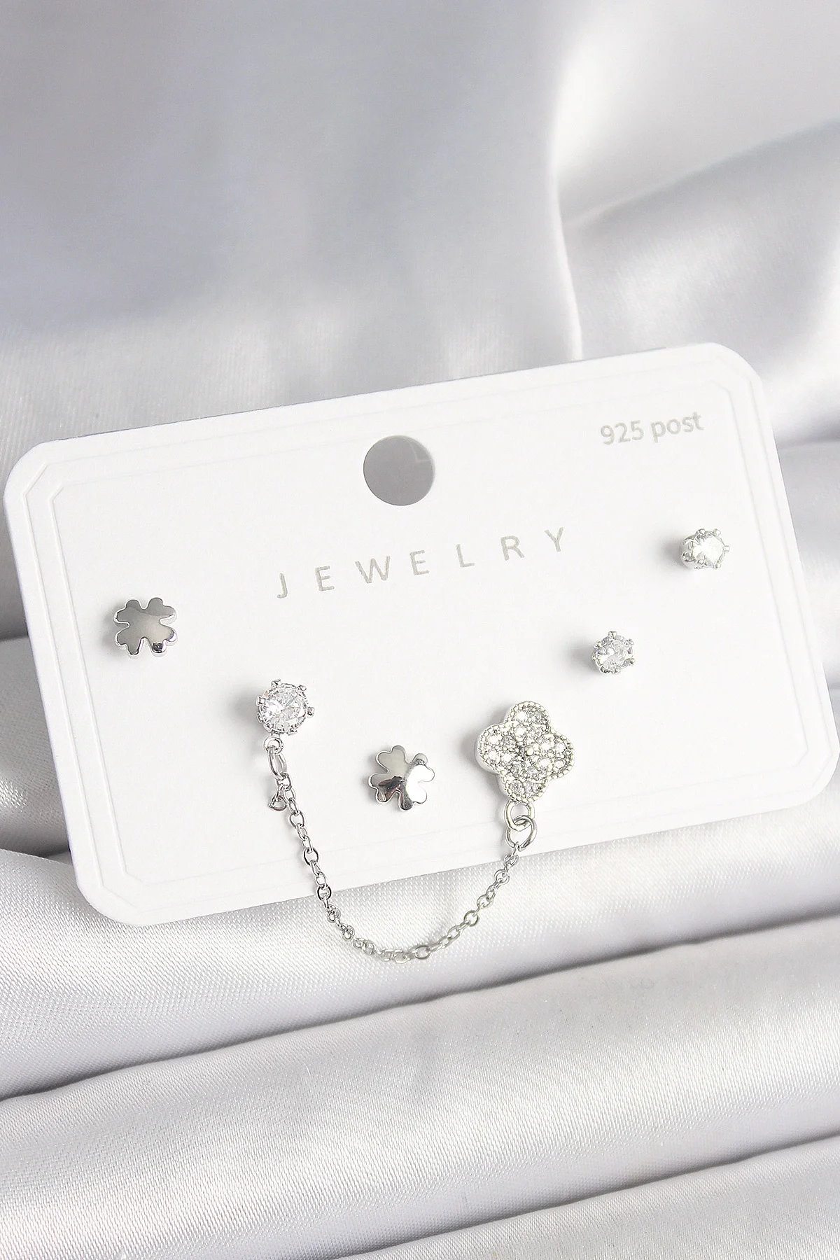 925 Ayar Gümüş Çivi Pirinç Gümüş Renk Zirkon Taşlı Yonca Model Sallantı Zincir Detay Kadın Küpe Seti