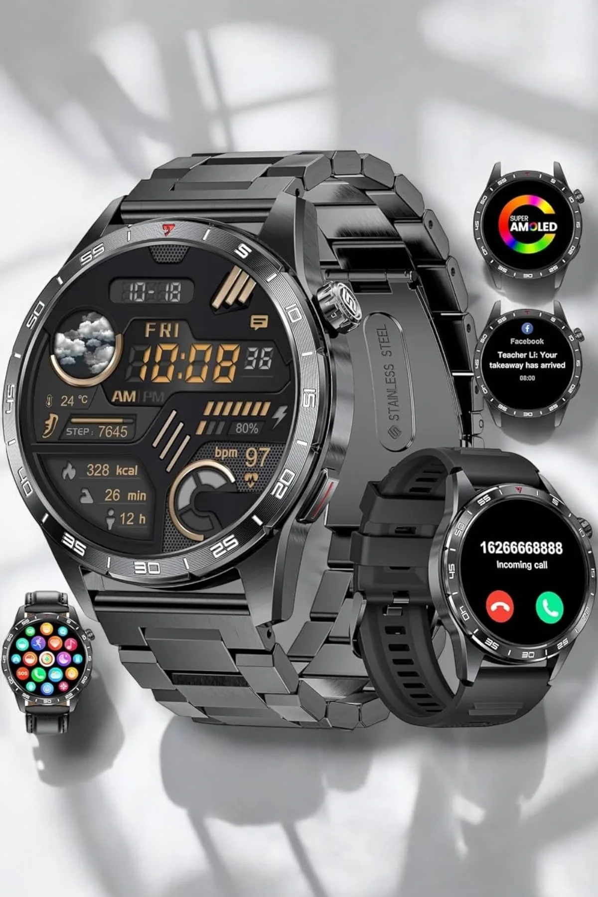 Akıllı Saat Amoled Ekran Metal Ve Deri Kordonlu Uyku ve Sağlık Takibi Titreşimli