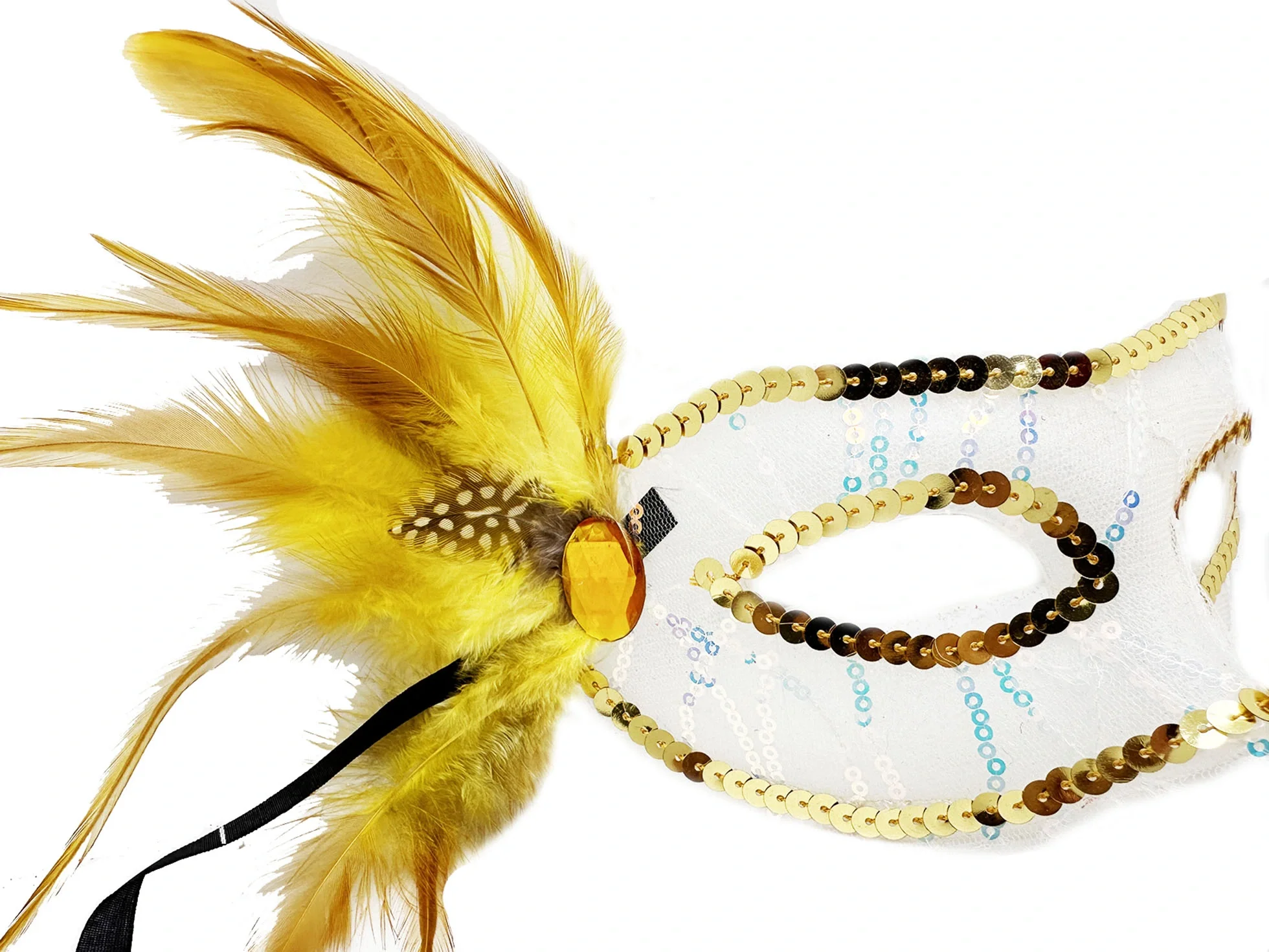 Altın Renk Yandan Tüylü Pul Payet İşlemeli Parti Maskesi 23x12 cm (5047)