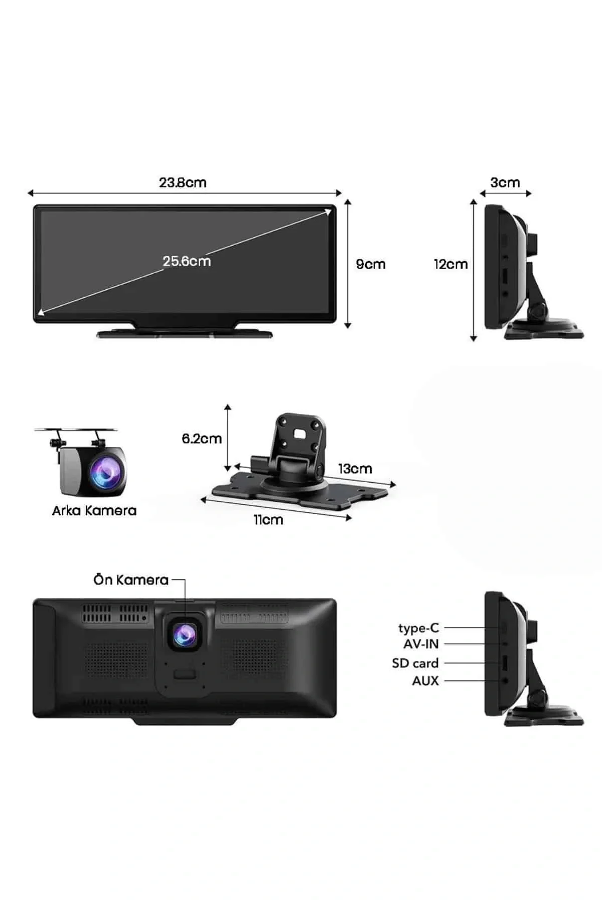 4K 10.2 İnç Çift Kameralı Araç Multimedya Ekranı CarPlay Kablosuz Tüm Cihazlara Uyumlu
