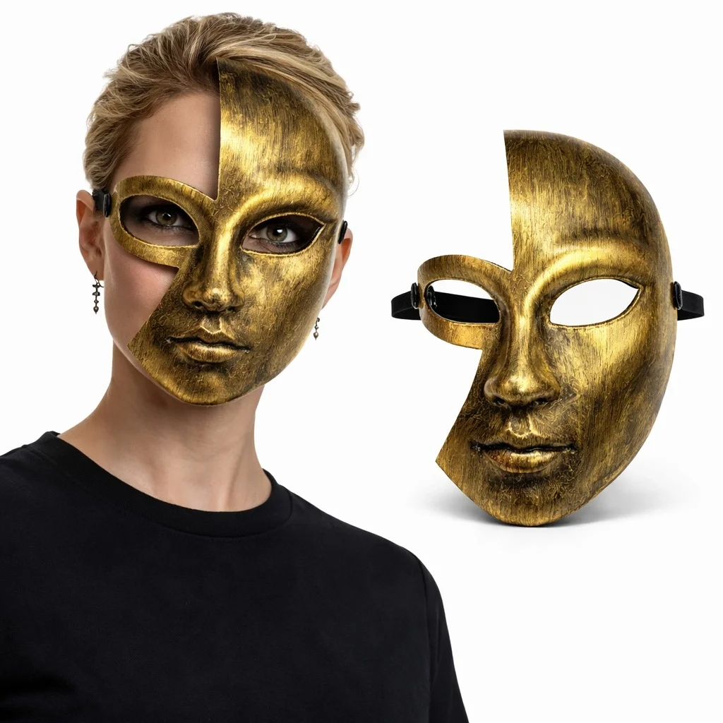 Antik efektli altın yarım yüz maskesi ile dikkat çekici ve karizmatik bir görünüm elde edin. Metalik gold yüzeyi ve özel eskitme dokusu sayesinde güçlü, gizemli ve sahneye yakışan bir stil sunar.