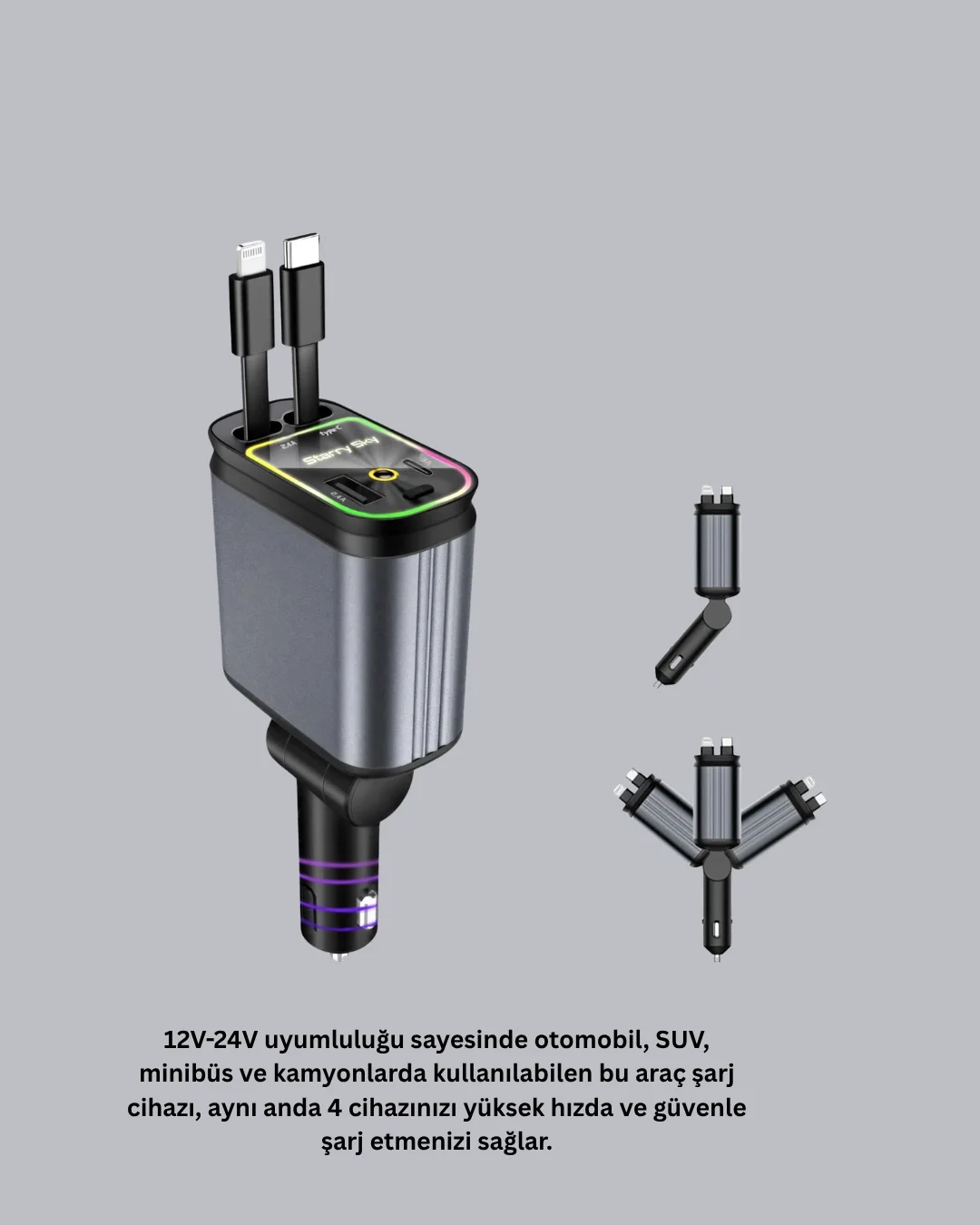 Araç Şarj Cihazı 4 Portlu 66W Hızlı Şarjlı LED Işıklı ve 180° Dönebilir