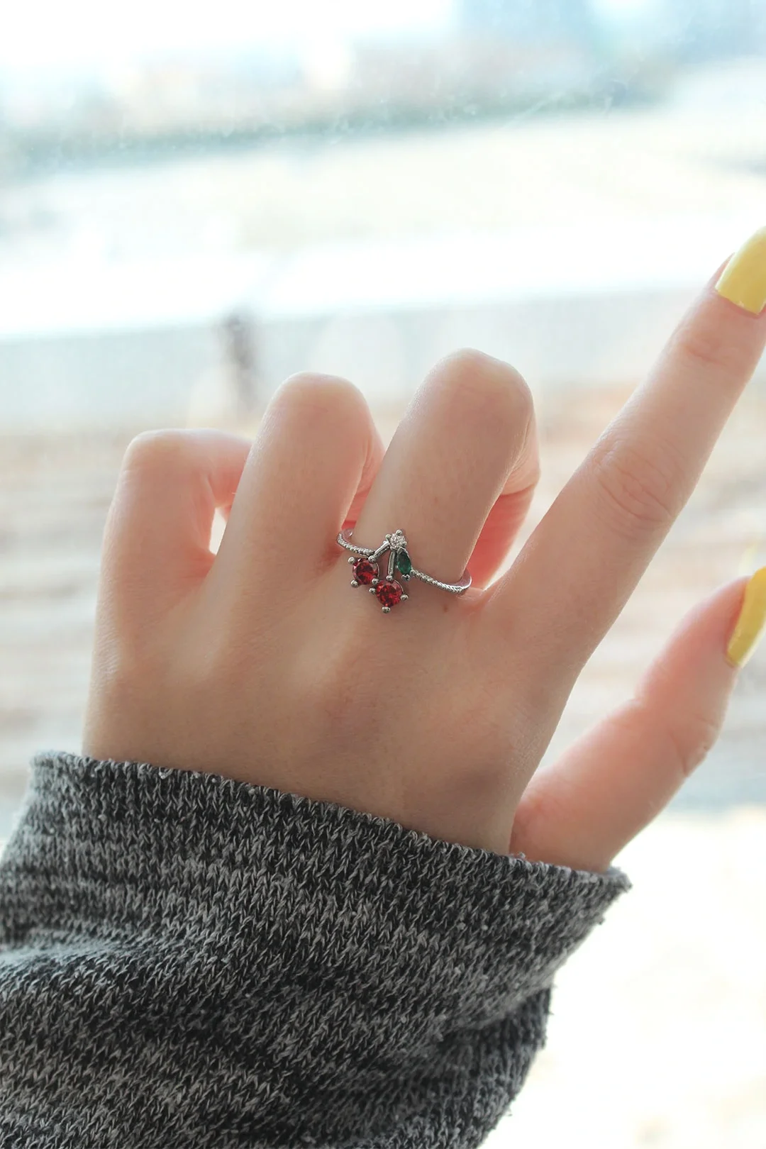 Ayarlamalı Gümüş Renk Kristal Taşlı Kiraz Yüzük