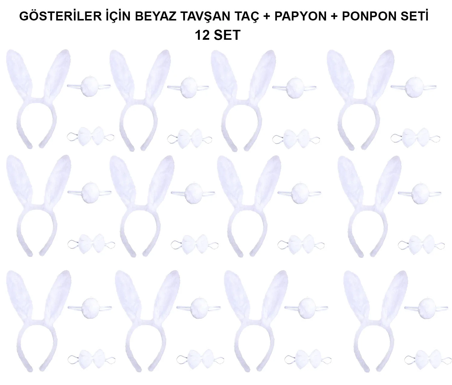 Beyaz Tavşan Kostüm Seti – 12’li Paket (Taç + Papyon + Ponpon)