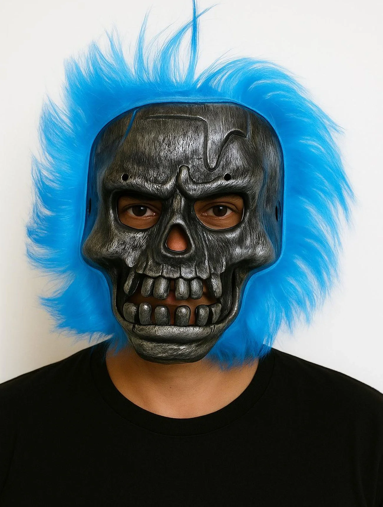 Maskenin etrafı lacivert saçlarla çevrilmiştir
