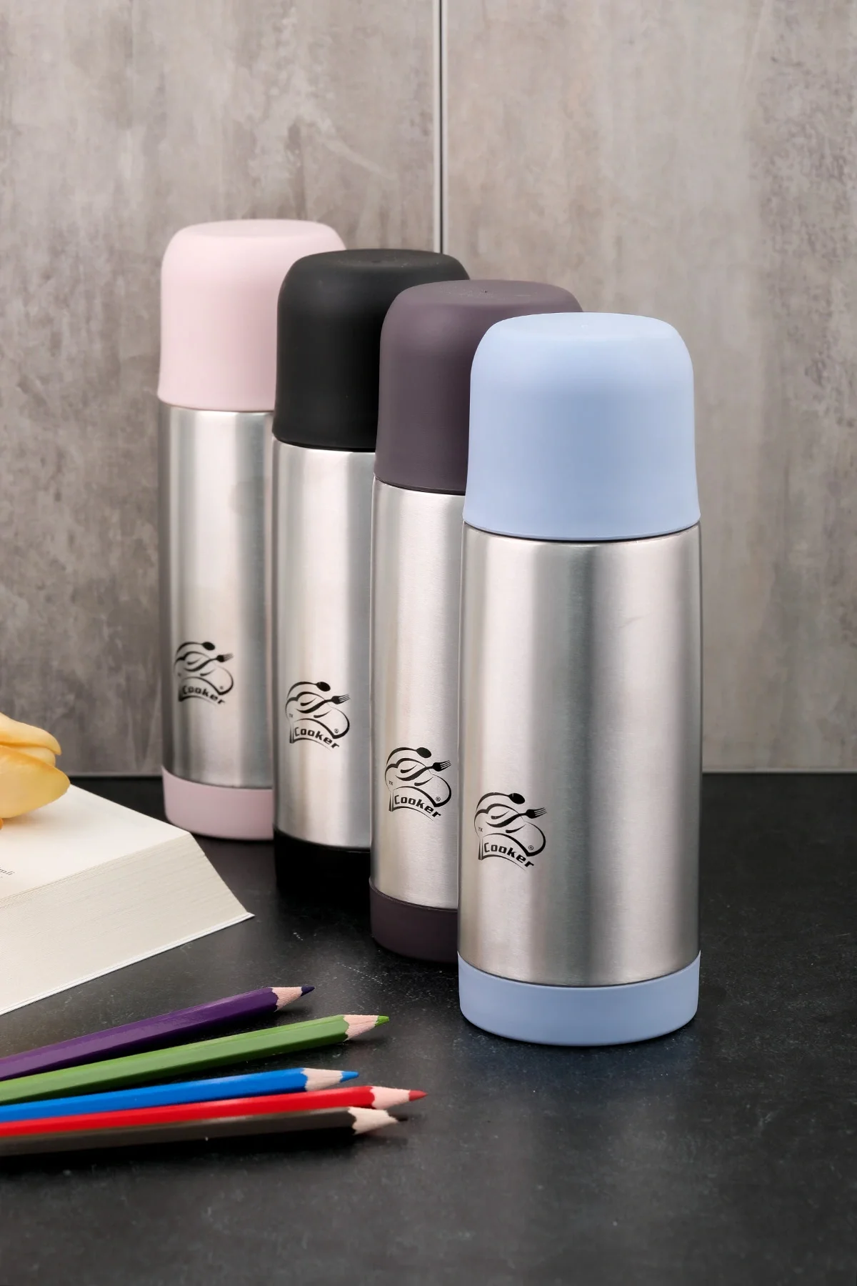 400ML TERMOS BARDAK RENKLİ PASLANMAZ ÇELİK - KAYDIRMAZ TPR TABAN - SIZDIRMAZ KAPAK (5047)