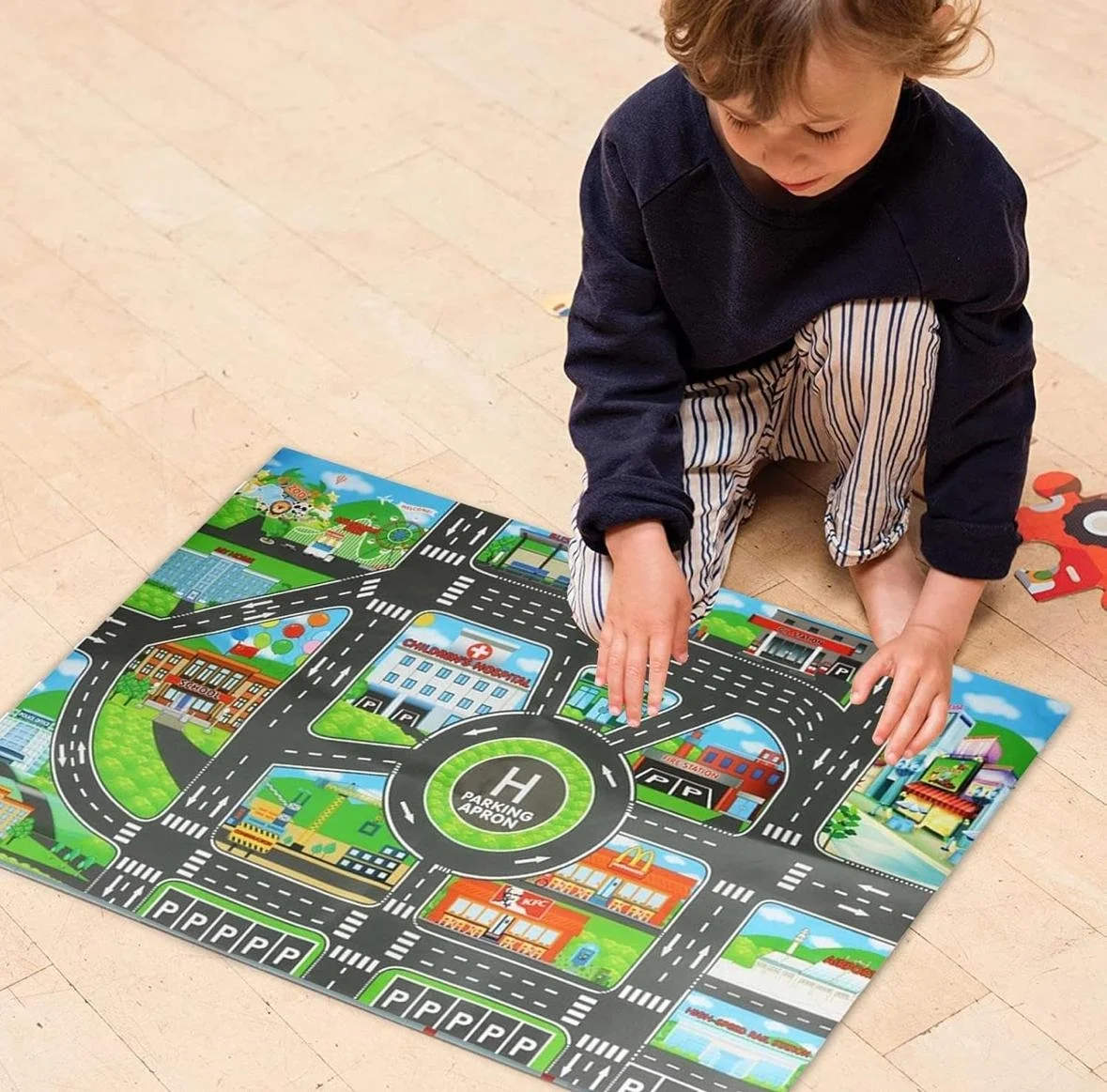 Yolda Oyun Süresi: Araba Halımızda renkli bir şehir manzarasını keşfedin ve canlı yollar ve binalarla yol maceralarını daha ilginç hale getirin. Çocuğunuzun hayal gücünü harekete geçirin ve daha fazla eğlenceyi teşvik eden canlı bir oyun alanı yaratın.