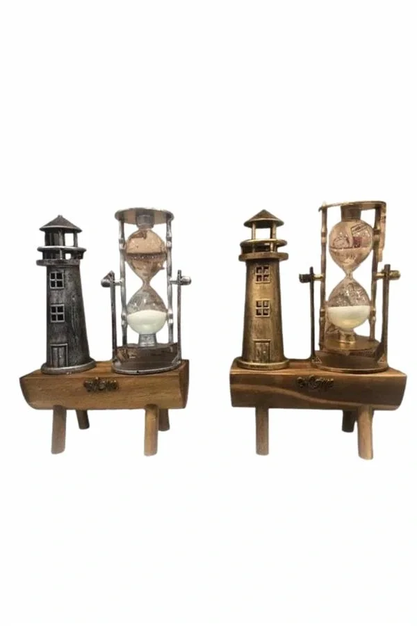 Dekoratif Ahşap Kum Saati ve Deniz Feneri Figürlü Masa Süsü – Şık ve Fonksiyonel Tasarım