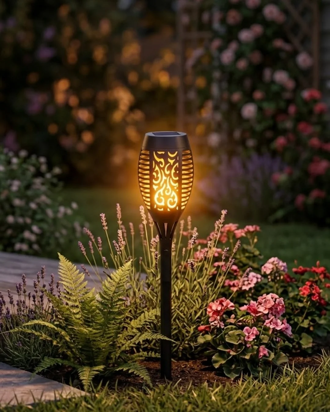 Güneş Enerjili Alev Görünümlü Bahçe Lambası Sensörlü LED Dış Mekan Dekoratif Aydınlatma