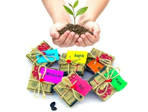 Özel kutuları içerisindeki Dilek Tohumları ile Sizin de en güzel dileklerinizi toprakla buluşturun! Üzerinde Şans, para, mutluluk, başarı, sağlık ve başarı mesaj kağıtları yer alan Dilek Tohumlarını toprağa ekin ve en güzel dileklerinizi toprakla buluşturun!
