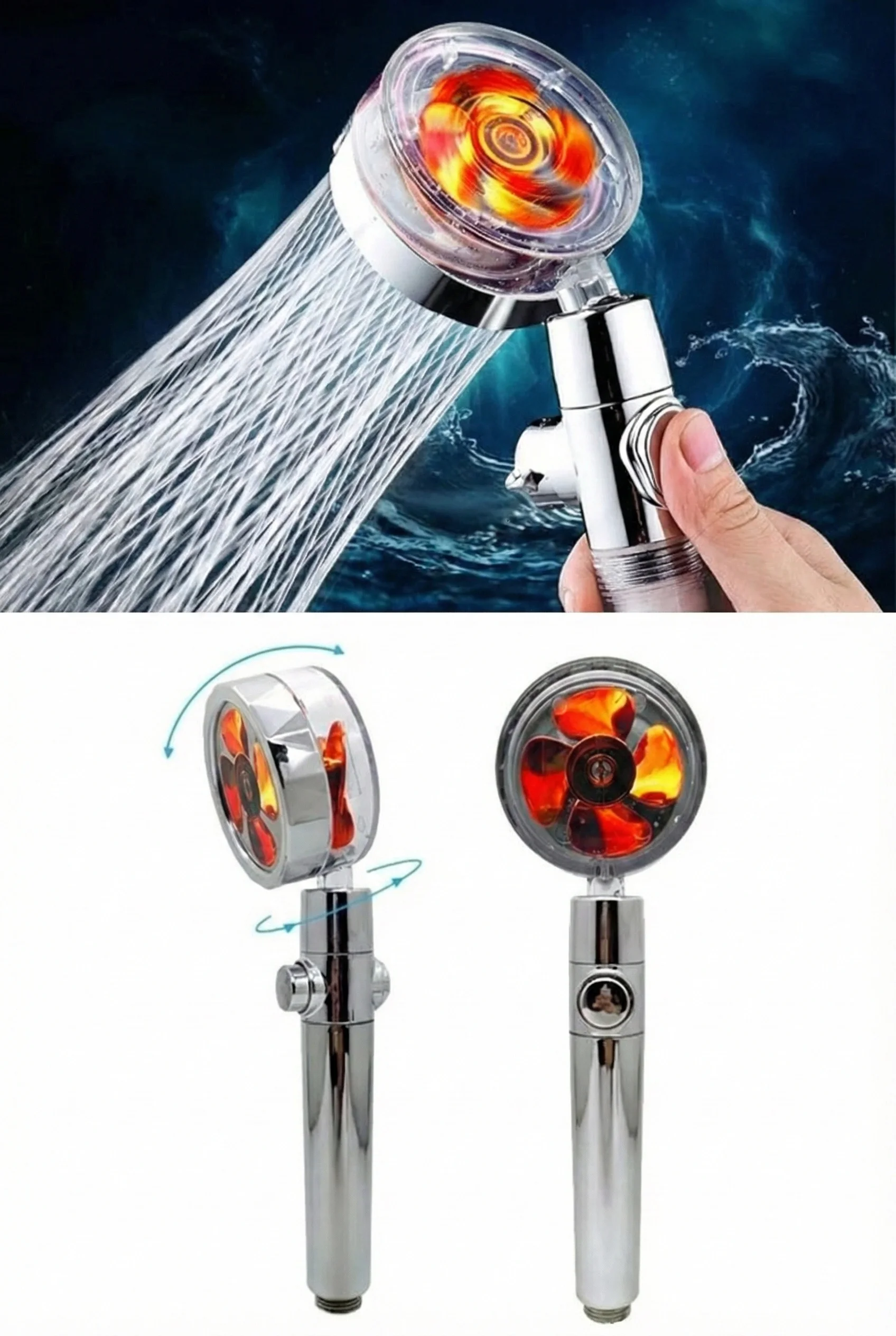 Duş Başlığı Turbo Pervaneli Serinletici Tasarım Start Stop Tuşu Duş Başlığı 360 Derece Döner