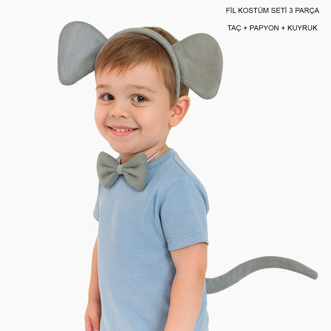 Fil Kostüm Seti 3 Parça, çocukların okul gösterilerinde, etkinliklerde ve özel günlerde rahatlıkla kullanabileceği sevimli ve hafif bir kostüm setidir.