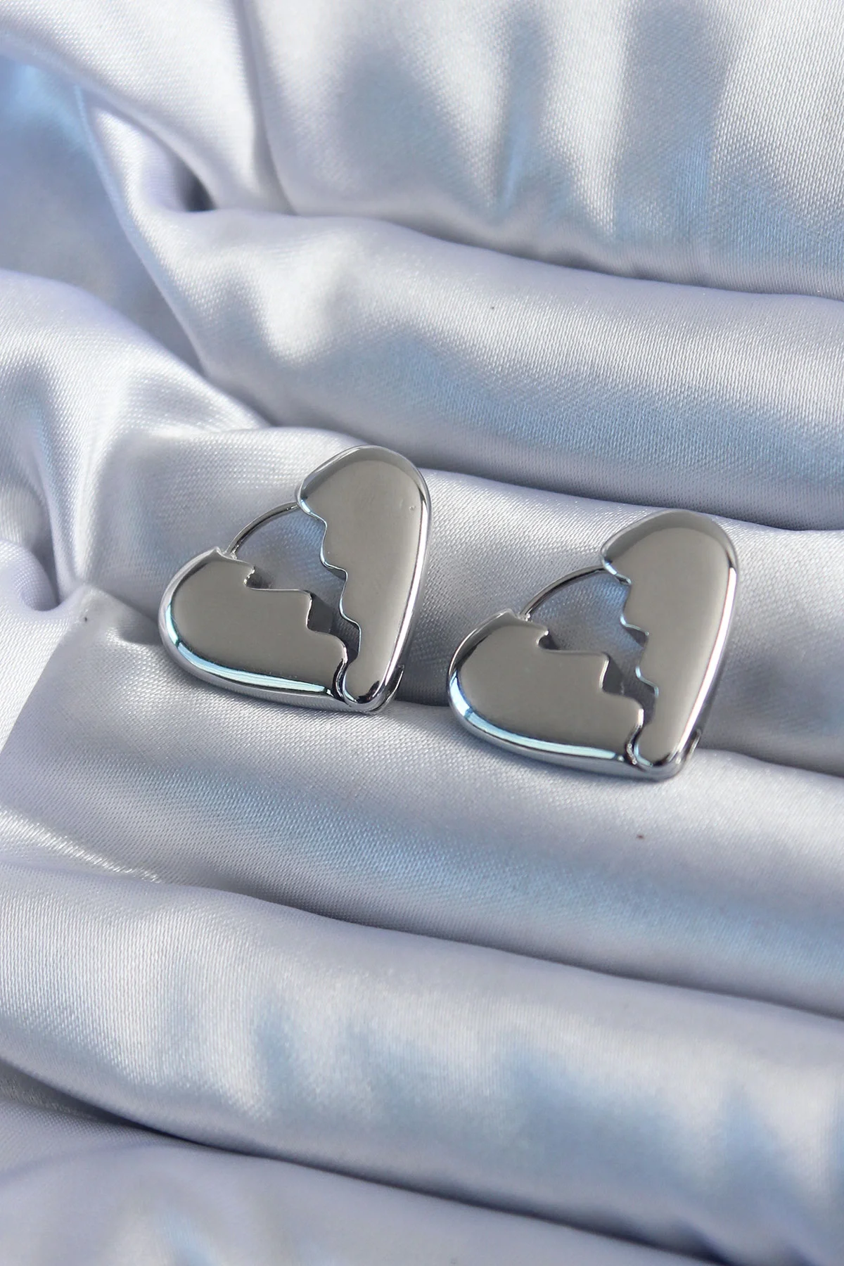 Gümüş Renk Kırık Kalp Model Pirinç Kadın Küpe