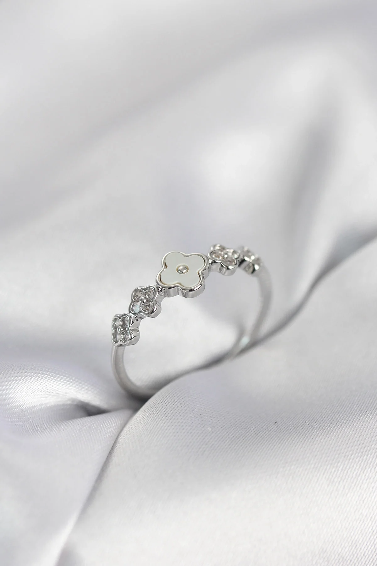 Gümüş Renk Minimal Yonca ve Zirkon Taşlı Kadın Yüzük