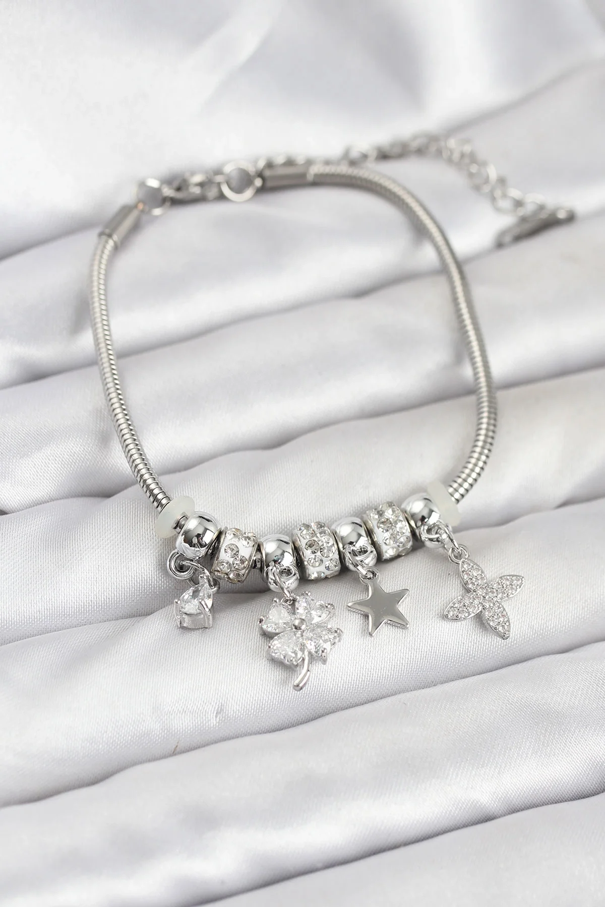 Gümüş Renk Pirinç Yonca Charmlı Kadın Bileklik