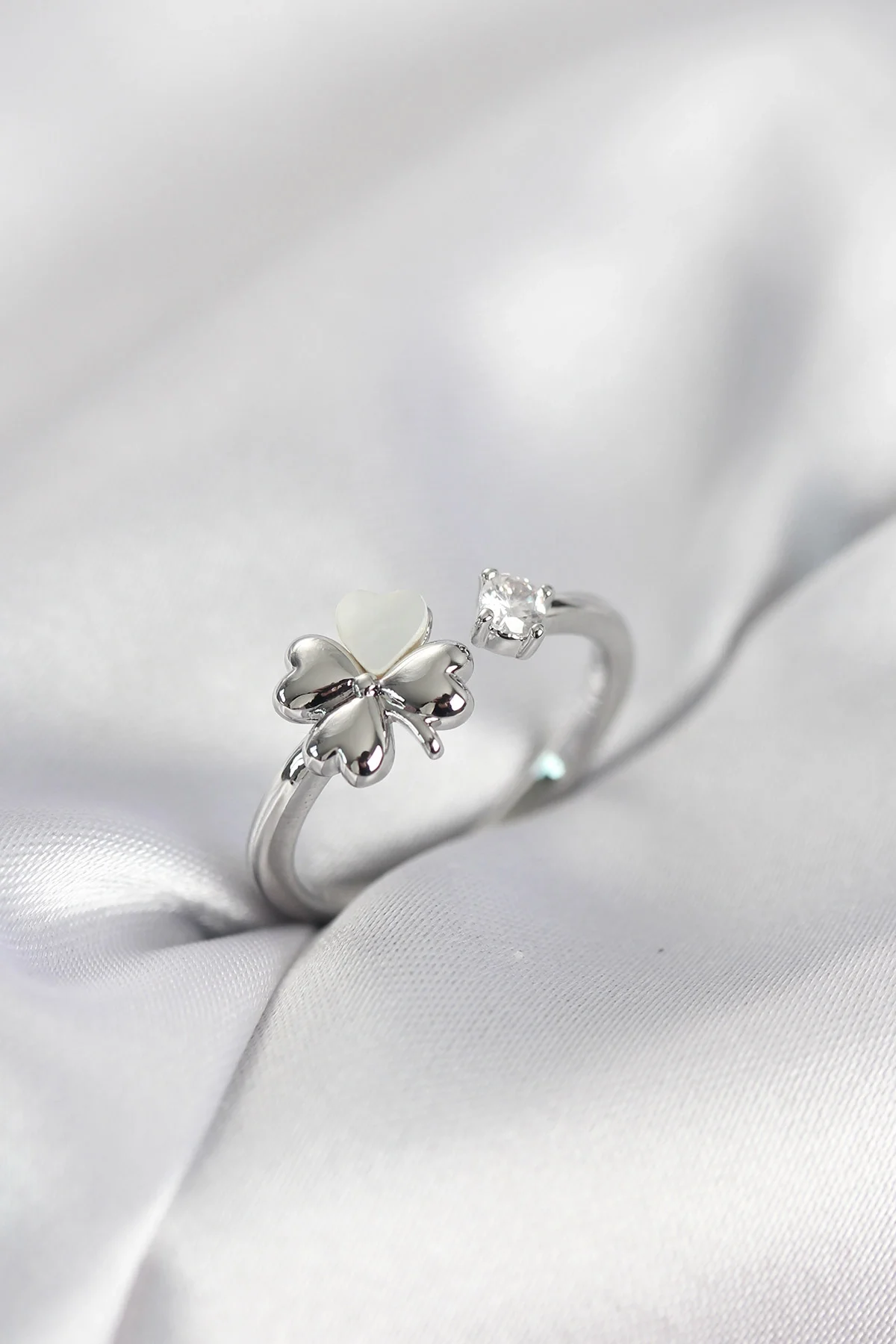 Gümüş Renk Yonca Model Sedefli Kadın Yüzük