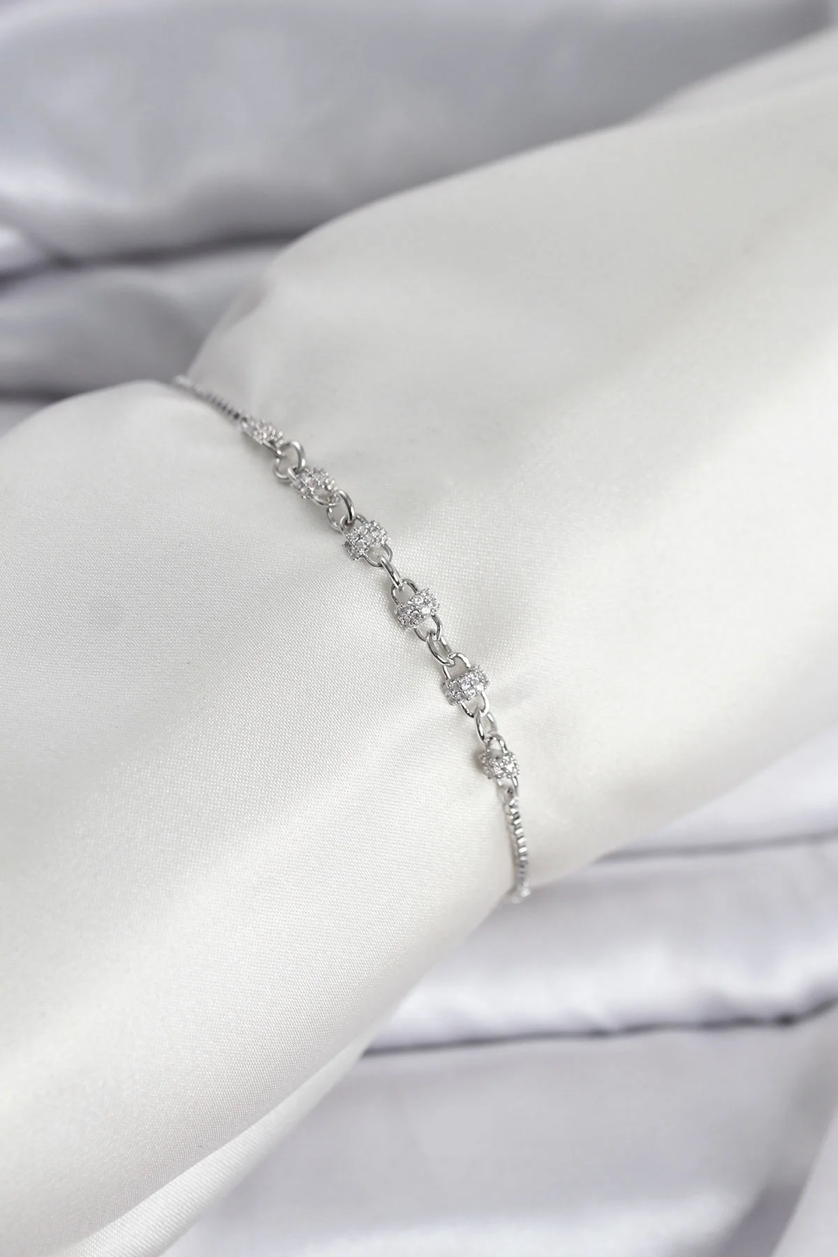 Gümüş Renk Zincir Model Zirkon Taşlı Pirinç Asansörlü Kadın Bileklik