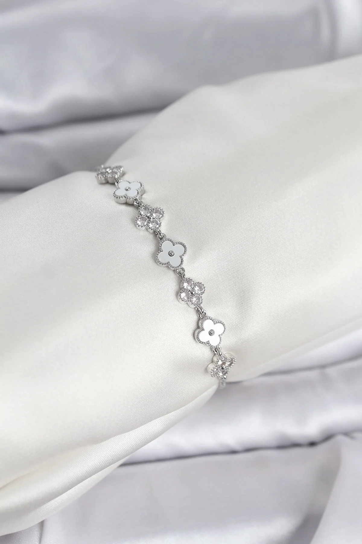 Gümüş Renk Zirkon Taşlı Sıralı Yonca Model Asansörlü Kadın Bileklik