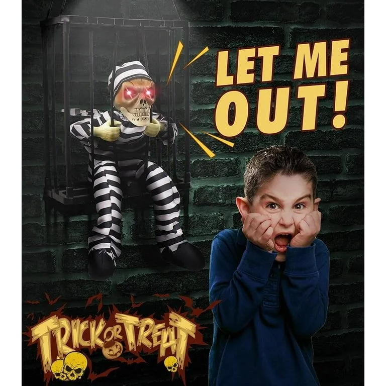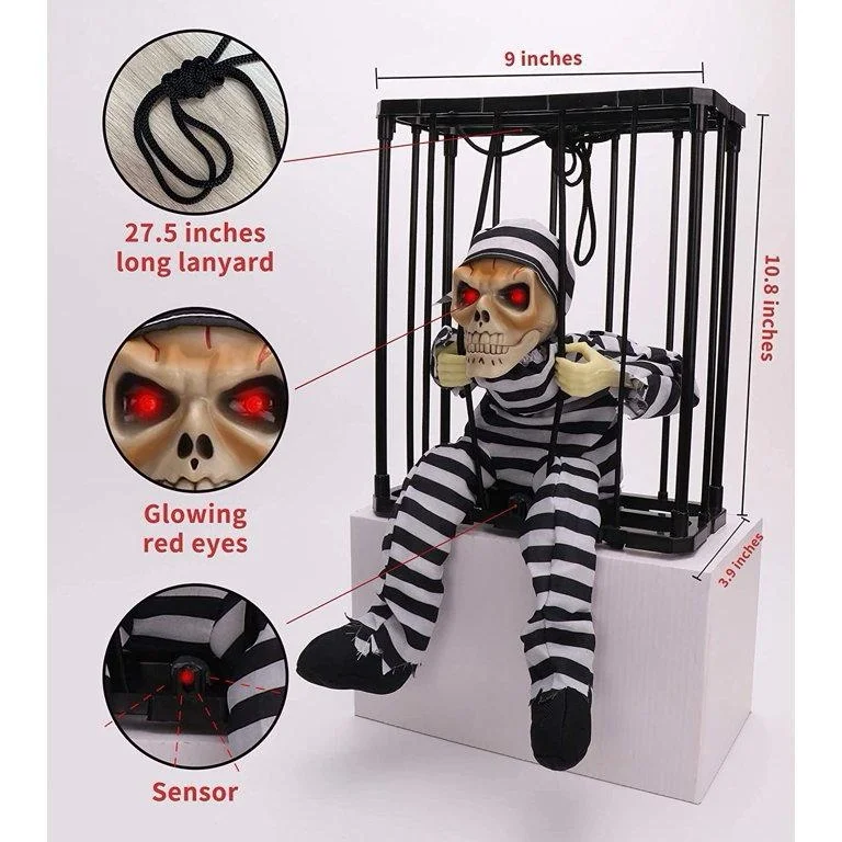 Hareketli Sesli Sensörlü Mahkum Görünümlü Kuru Kafa İskelet Dekorasyon