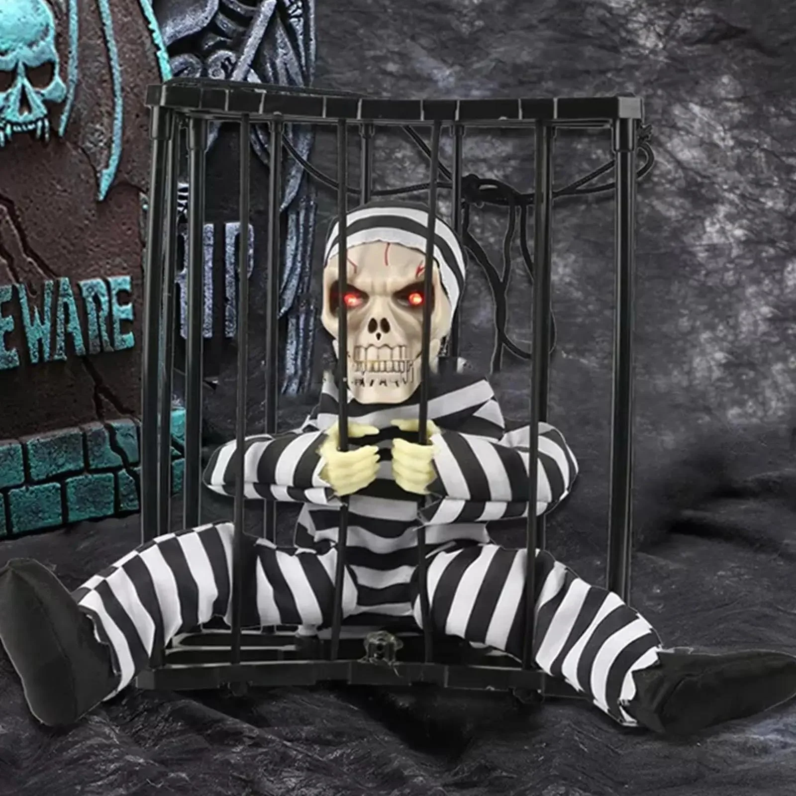 Hareketli Sesli Sensörlü Mahkum Görünümlü Kuru Kafa İskelet Dekorasyon 22x27 cm