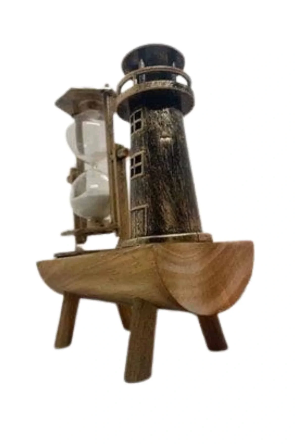 Dekoratif Ahşap Kum Saati ve Deniz Feneri Figürlü Masa Süsü – Şık ve Fonksiyonel Tasarım